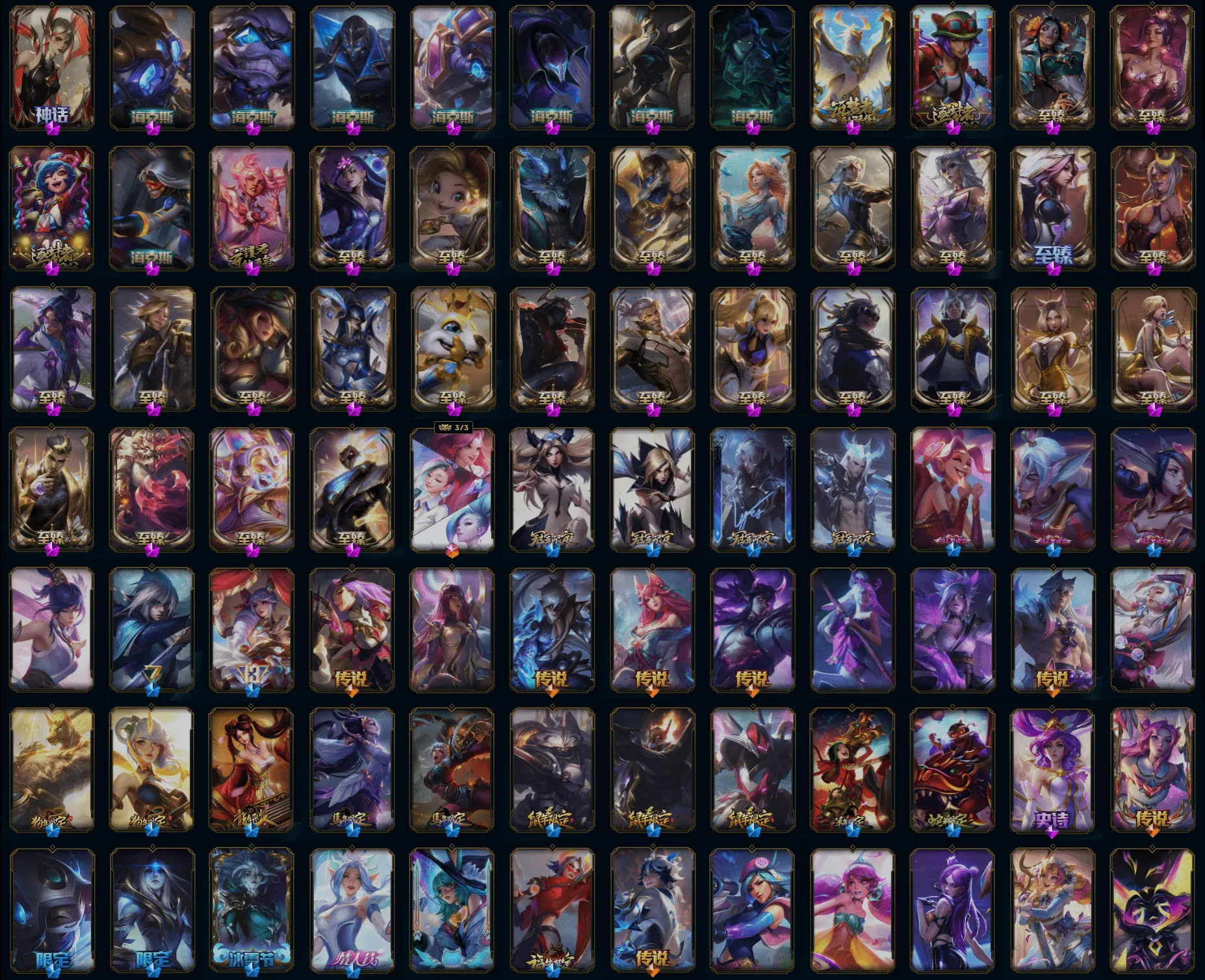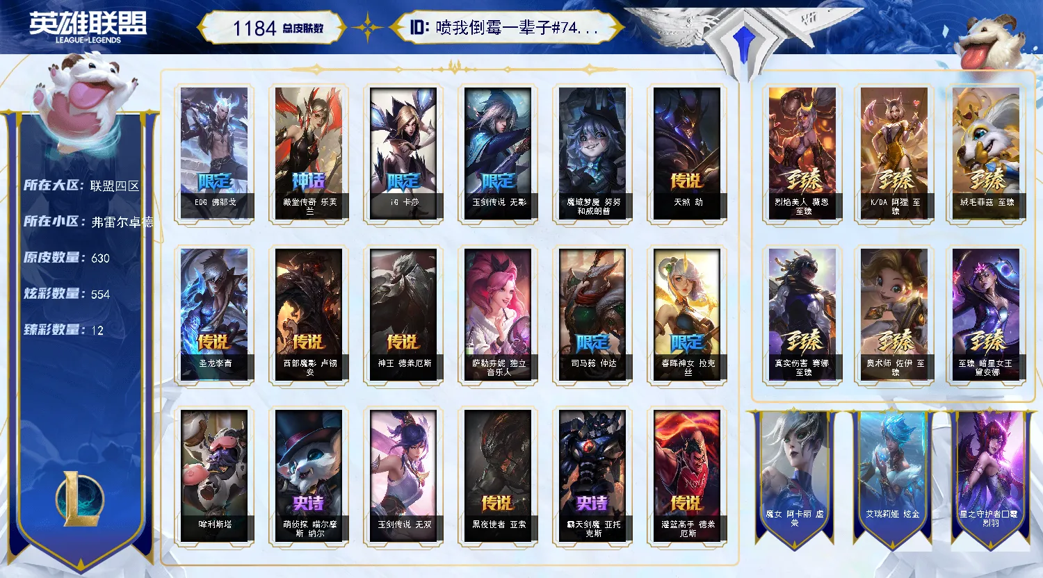 【重要皮肤】暗星女王黛安娜至臻 T1杰斯至臻 魂蔷薇烈娜塔至臻 花仙使者卡特琳娜至臻 绝息圣堂厄运小姐至臻 剪纸仙灵希维尔至臻 青花瓷丽桑卓至臻 北极星使者沃里克至臻 灵魂莲华易至臻 海之歌萨勒芬妮至臻 西部魔影猎天使恶魔泰隆至臻 魅惑女巫莫甘娜至臻 战斗学院蕾欧娜至臻 太空律动璐璐至臻 奥术师佐伊至臻 真实伤害亚索至臻 真实伤害赛娜至臻 灵能特工伊泽瑞尔至臻 源计划逆流塞拉斯至臻 黑夜使者凯隐至臻 神龙尊者均衡之龙沃利贝尔至臻 飞升战神潘森至臻 KDA阿狸至臻 KDA伊芙琳至臻 烈焰美人薇恩至臻 烈焰美人薇恩2022至臻 绒毛菲兹至臻 绒毛菲兹2022至臻 未来战士锤石至臻 未来战士锤石2022至臻 殿堂传奇乐芙兰 海克斯科技克格莫 海克斯科技吉格斯 海克斯科技阿木木 海克斯科技魔腾 星之守护者塔莉垭 零之枪骑赫卡里姆 摄魂使者薇恩 新创战纪希维尔 胜利女神娑娜 胜利巨口克格莫 创星之灵璐璐 养蜂人辛吉德 玉剑传说无影 女帝格温 替父从军花木兰 神龙烈焰金克丝 碧玉之牙卡西奥佩娅 古琴余韵娑娜 春晖神女拉克丝 北辰之威内瑟斯 美猴王孙悟空 广寒仙子嫦娥 虎痴之拳蔚 司马懿仲达 金猪烈焰瑟庄妮 神龙之翼库奇 王国机神青龙德莱文 王国机神朱雀蕾欧娜 王国机神白虎贾克斯 福牛守护者菲奥娜 胜利女神瑟庄妮 胜利机器人布里茨 胜利枪神卢锡安 胜利之剑亚托克斯 水晶玫瑰迦娜 甜心之羽霞 甜心之翎洛 甜心宝贝安妮 觅心萝莉金克丝 北极星神黛安娜 冬境仙灵索拉卡 雪球也能爆炸吉格斯 圣诞捣蛋鬼金克丝 圣诞老人德莱文 冰雪女神辛德拉 夺命美人卡特琳娜 平安夜女神娑娜 魅惑女巫厄运小姐 魅惑女巫奈德丽 伯爵卡萨丁 死亡誓约劫 泳池派对蕾欧娜 泳池派对瑟提 御星魔矢艾希 制胜金球拉莫斯 EDG厄斐琉斯 EDG佛耶戈 DWG奈德丽 FPX墨菲特 SSG塔莉垭 SSG嘉文四世 SKTT1辛德拉 SKTT1娜美 SKTT1瑞兹 SKTT1阿兹尔 SSW图奇 SSW辛吉德 SKTT1劫 暗杀星蒙多 暗杀星伊泽瑞尔 Fnatic迦娜 Fnatic库奇 Fnatic嘉文四世 冰雪节玛尔扎哈 钢铁之翼艾尼维亚 冠军之血希瓦娜 冠军之隐劫 春晖神女奇亚娜 鬼影森森茂凯 胡桃夹子萨科 密林猎手提莫 南瓜头费德提克 女猎手希维尔 圣诞精灵崔丝塔娜 圣诞狂欢努努和威朗普 圣诞老人古拉加斯 糖果使徒费德提克 外星装甲库奇 无头骑士赫卡里姆 邪恶圣诞老人维迦 幸福女神乐芙兰 野兽猎人德莱文 野兽猎人瑟庄妮 野兽猎人泰达米尔 暗影沃里克 战场BOSS吉格斯 波比的巧克力工坊 都铎王朝图奇 十五周年纪念希维尔 十周年纪念安妮 神凰行者瑞羽圣凰艾尼维亚 胜利凤凰艾尼维亚 KDAALLOUT萨勒芬妮独立音乐人 KDAALLOUT萨勒芬妮明日新星 KDAALLOUT萨勒芬妮超级巨星 绝息圣堂洛