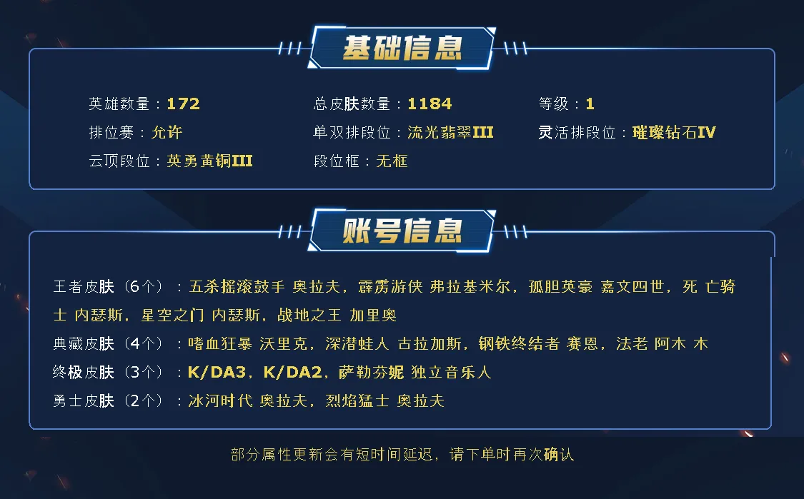 ~~喜欢记得收藏~~可排位~~1200皮全英雄丨589原皮379炫彩丨90神话/至臻/海克斯丨灵魂莲华套丨甜心霞洛丨福牛剑姬丨嫦娥皎月丨替父从军丨创星璐璐丨御星艾希丨电玩女警丨律动格温丨甜心格温丨KDA卡莎丨青花瓷ez丨幻灵阿罗拉丨北极星皎月丨觅心金克斯丨羊年金克斯丨IG卡莎刀妹丨至高天薇古丝丨水晶玫瑰风女丨星守卡莎风女丨玉剑男刀剑姬丨女帝格温卡特丨神龙尊者李青卡尔玛丨鼠年武器日女德莱文丨EDG佛耶戈厄斐琉斯~~租之前尽量查一下游戏ID,确保段位是您需要的,避免浪费您的时间~~请勿挂机逃跑故意送人头,谢谢合作,谢谢~~