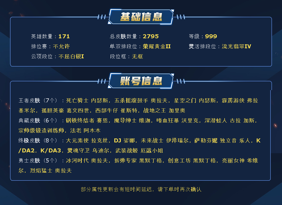 ~~喜欢记得收藏~~可排位~~2700皮全英雄丨1379原皮1280炫彩丨90神话/至臻/海克斯丨IG套丨神龙尊者套丨灵魂莲华套丨福牛守护者套丨幻灵套丨鼠年套丨剪纸仙灵套丨虎年套丨执事套丨电玩套丨女帝套丨EDG套丨KDA套丨FPX套丨DWG套丨青花瓷套丨情人节套丨太空律动套丨光明哨兵套丨咖啡甜心套丨破败军团套丨水晶玫瑰套丨幽梦玫瑰套丨星之守护者套丨龙瞎/龙的传人丨斩星剑圣丨穿星赵信丨莲花卡尔玛丨玉剑男女刀~~租之前尽量查一下游戏ID,确保段位是您需要的,避免浪费您的时间~~请勿挂机逃跑故意送人头,谢谢合作,谢谢~~