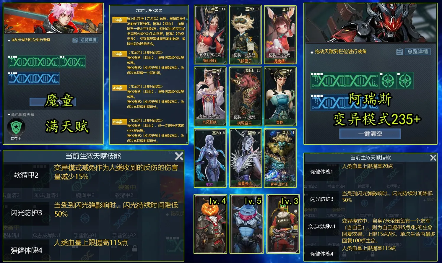 此号亮点:新配件武器烛阳带皮肤,变异天赋全,变异武器全,满级亢龙吟,三广陵,三撼天,双飞梭,双风神,双塞壬,五把连城,两把伏虎,两把炎黄,冒险1400w,全模式畅玩,V11新角色,万化主宰,最新传说断罪终焉带皮肤紫黛,流影贰,血清已补