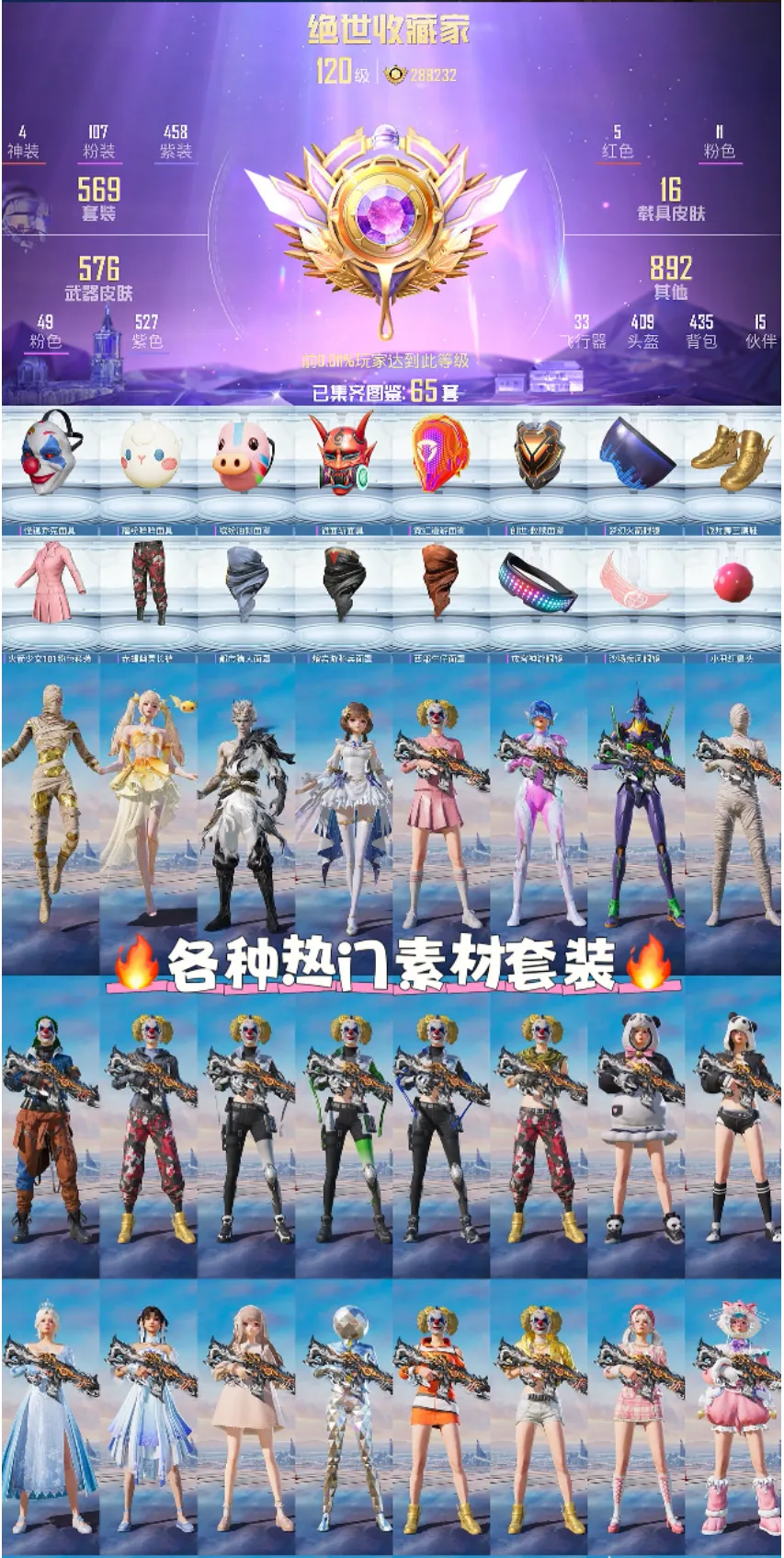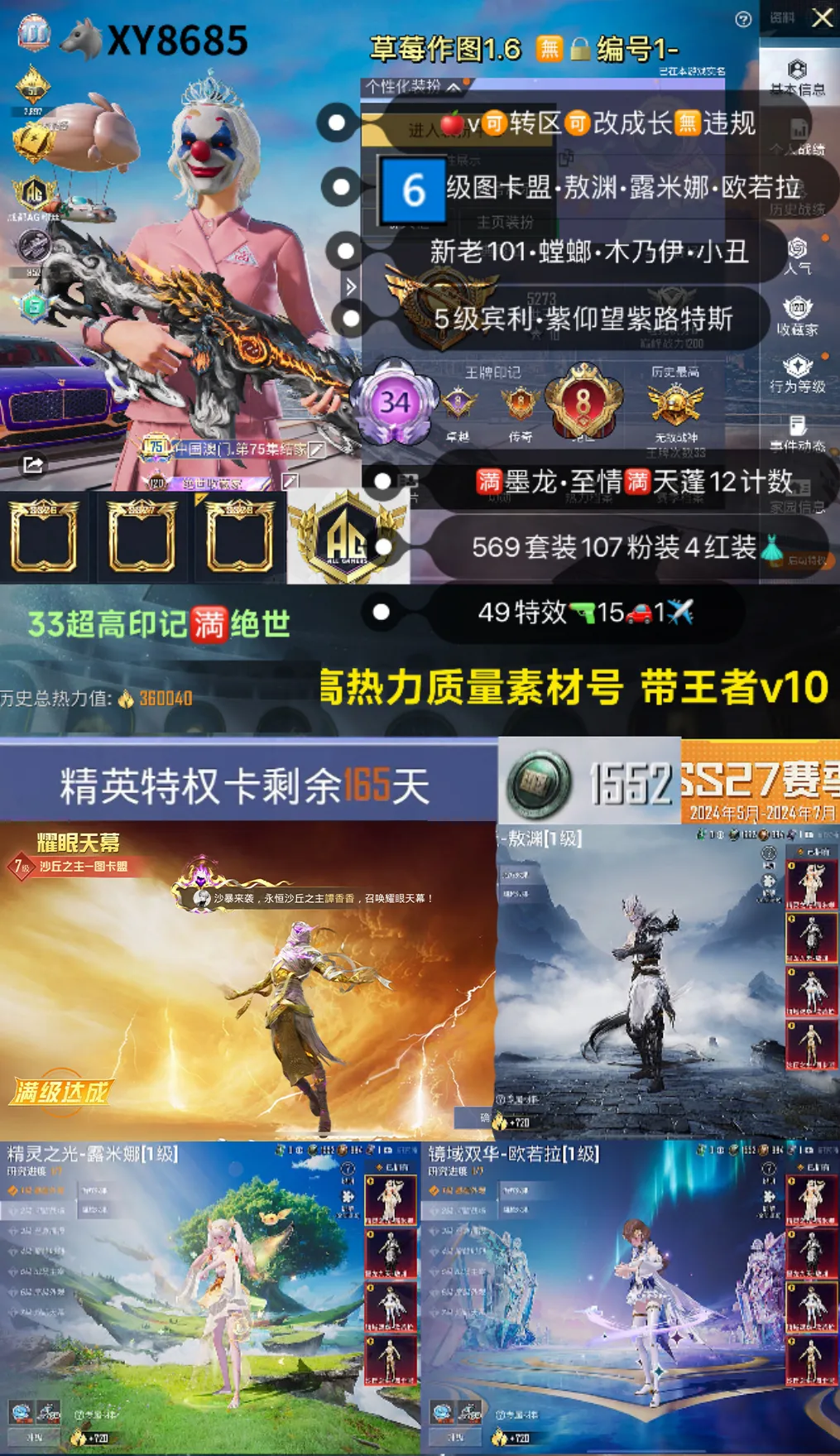 34印记✨3战神框✨满级木乃伊,墨龙九天,精灵之光,欧若拉✨老101✨诡面斩面具,5把9级枪,1把8级,紫螳螂✨小丑✨雪国✨赵灵儿✨3套追光服✨老木乃伊✨赤蝎金鞋都市,107粉49特效✨15车1飞机✨5级宾利