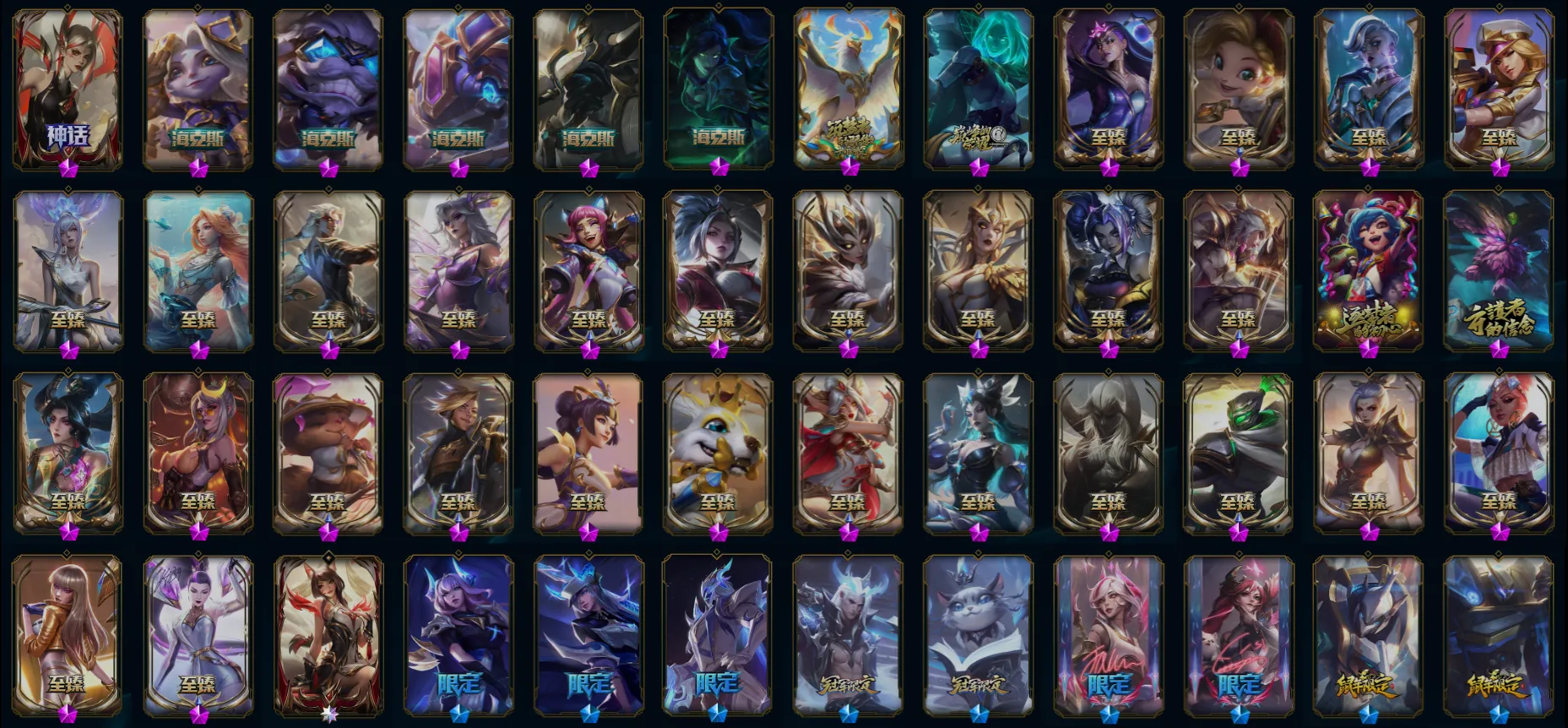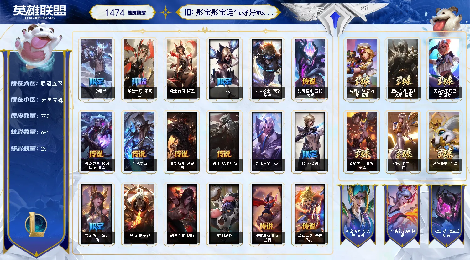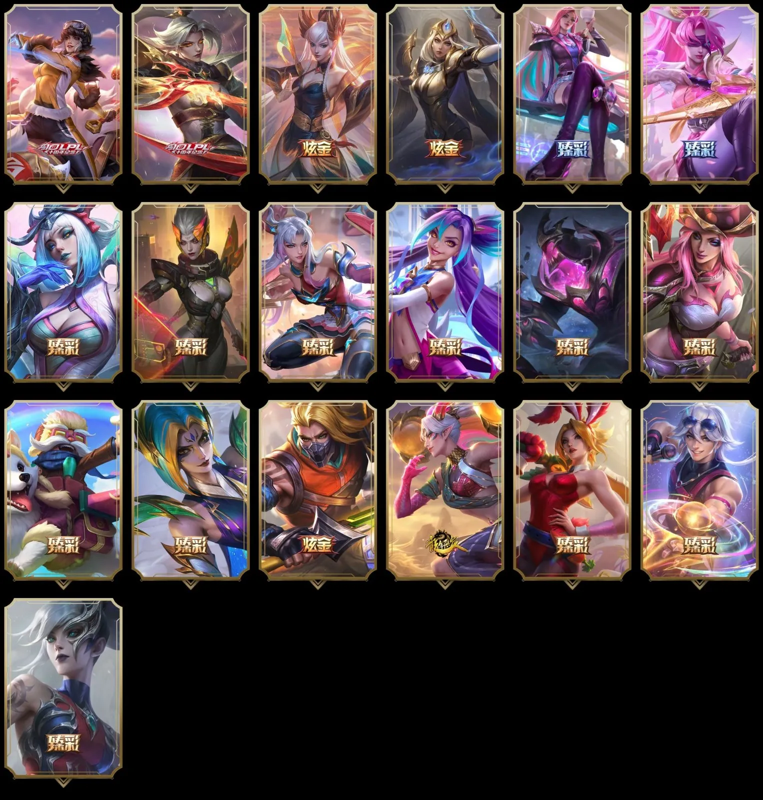【重要皮肤】殿堂传奇阿狸 剪纸仙灵卡西奥佩娅至臻 暗星女王黛安娜至臻 魔域梦魇泽丽至臻 北极星钢影卡蜜尔至臻 魔女阿卡丽至臻 花仙使者卡特琳娜至臻 海珀利安小队X09星环灵风迦娜至臻 星之守护者辛德拉至臻 海之歌萨勒芬妮至臻 幻灵战斗猫金克丝至臻 青花瓷拉克丝至臻 神凰行者烈羽焰凰霞至臻 女帝黛安娜至臻 魔女婕拉至臻 魔女乐芙兰至臻 奥术师佐伊至臻 灵魂莲华提莫至臻 灵能特工伊泽瑞尔至臻 黑夜使者凯隐至臻 征服者贾克斯至臻 KDA二代卡莎至臻 KDA一代卡莎至臻 KDA卡莎2022至臻 烈焰美人薇恩至臻 烈焰美人薇恩2022至臻 电玩女神凯特琳至臻 真实伤害奇亚娜至臻 真实伤害奇亚娜2022至臻 绒毛菲兹至臻 玉剑传说武剑仙至臻 腥红之月亚托克斯至臻 殿堂传奇乐芙兰 海克斯科技克格莫 海克斯科技吉格斯 海克斯科技崔丝塔娜 永恒之森奥恩 零之枪骑赫卡里姆 摄魂使者薇恩 胜利剑圣易 胜利女神娑娜 胜利之王泰达米尔 胜利巨口克格莫 勇敢的心德莱厄斯 电玩女神厄运小姐 玉剑传说舞剑仙 神凰行者烈羽焰凰霞 海珀利安小队Y03权天使卡蜜尔 玉剑传说神机花火 玉剑传说无劫 玉剑传说舞龙卫 玉剑传说星仙子 玉剑传说翼剑仙 银龙裁决泰隆 天龙之子斯莫德 剪纸仙灵艾瑞莉娅 神龙烈焰金克丝 你看见过我的熊猫吗安妮 美猴王孙悟空 紫金罗刹莫甘娜 广寒仙子嫦娥 虎痴之拳蔚 烈焰美人薇恩 王国机神苍狼瑟提 王国机神玄武盖伦 胜利机器人布里茨 胜利女神奥莉安娜 胜利枪神格雷福斯 胜利枪神卢锡安 胜利之剑亚托克斯 觅心魔灵奥莉安娜 觅心女王艾希 觅心猎手薇恩 冬季仙境奥莉安娜 狂心冰王图奇 冰封王子蒙多 魄罗骑士瑟庄妮 平安夜女神娑娜 魅惑女巫伊莉丝 死亡誓约劫 灵魂收割者索拉卡 勇敢的心德莱厄斯 海之歌艾希 泳池派对凯特琳 泳池派对奥莉安娜 泳池派对菲奥娜 泳池派对格雷福斯 泳池派对李青 泳池派对雷克顿 斩星魔剑易 穿星魔锋赵信 御星魔矢艾希 T1奥莉安娜 T1金克丝 DRX亚托克斯 DRX千珏 DRX凯特琳 DRX艾希 EDG佛耶戈 EDG悠米 FPX薇恩 iG卡蜜尔 iG卡莎 iG艾瑞莉娅 iG菲奥娜 SSG霞 SSG伊泽瑞尔 SKTT1烬 SKTT1辛德拉 SKTT1奥拉夫 SKTT1卡莉丝塔 SKTT1瑞兹 SKTT1阿兹尔 SKTT1伊莉丝 SKTT1雷克顿 SSW雷恩加尔 SSW泰隆 SSW图奇 SKTT1贾克斯 SKTT1劫 SKTT1婕拉 SKTT1薇恩 暗杀星蒙多 暗杀星慎 Fnatic迦娜 Fnatic库奇 冰雪节辛吉德 防暴天使凯尔 钢铁之翼艾尼维亚 冠军典狱长锤石 冠军掠夺者卡兹克 冠军蔷薇乐芙兰 冠军之矛卡莉丝塔 冠军之刃锐雯2016 冠军之血希瓦娜 冠军之隐劫 冠军之志瑞兹 鬼影森森茂凯 鬼影重重魔腾 海贼瑞兹 胡桃夹子萨科 警用试作体K9内瑟斯 魅惑女巫悠米 南瓜头费德提克 圣诞精灵崔丝塔娜 圣诞开心鬼提莫 圣诞狂欢努努和威朗普 圣诞玩偶波比 卧虎藏龙贾克斯 无头骑士赫卡里姆 喜庆之树茂凯 邪恶圣诞老人维迦 幸福女神乐芙兰 雪默丁格 野兽猎人瑟庄妮 英勇玩具兵普朗克 永恒之森乐芙兰 征服者韦鲁斯 暗影沃里克 冠军之箭艾希 机械迷城加里奥 战场BOSS吉格斯 阿木木主人不要我了 2023全球总决赛雷克顿 2021全球总决赛嘉文四世 波比的巧克力工坊 都铎王朝图奇 十五周年纪念希维尔 十周年纪念安妮 源代码乐芙兰 神凰行者瑞羽圣凰艾尼维亚 胜利凤凰艾尼维亚 灵魂守卫乌迪尔 未来战士伊泽瑞尔