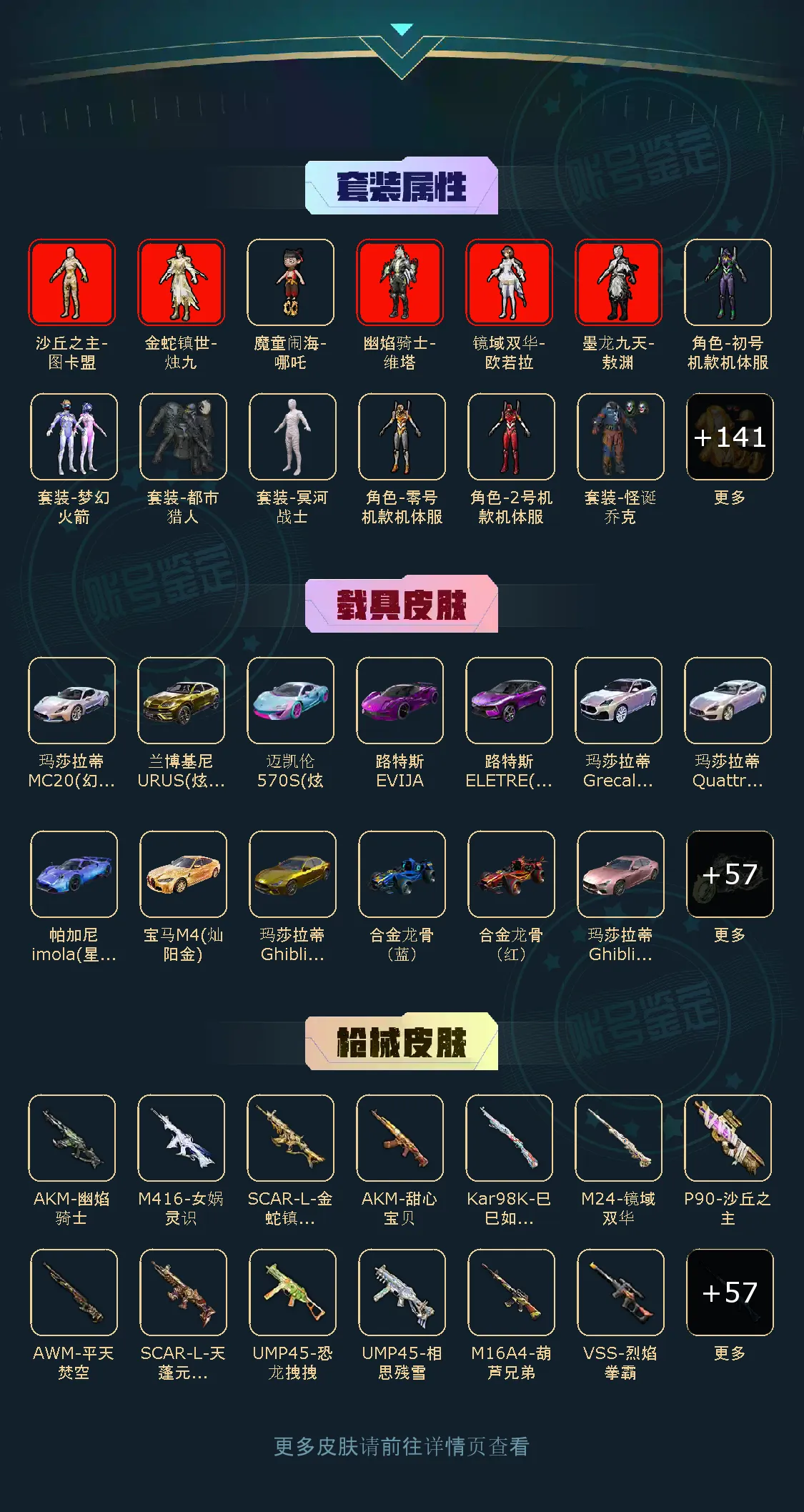 9级M416女娲灵识、9级AKM幽焰骑士、9级SCAR金蛇镇世、9级SCAR天蓬元帅、9级AWM平天梵空