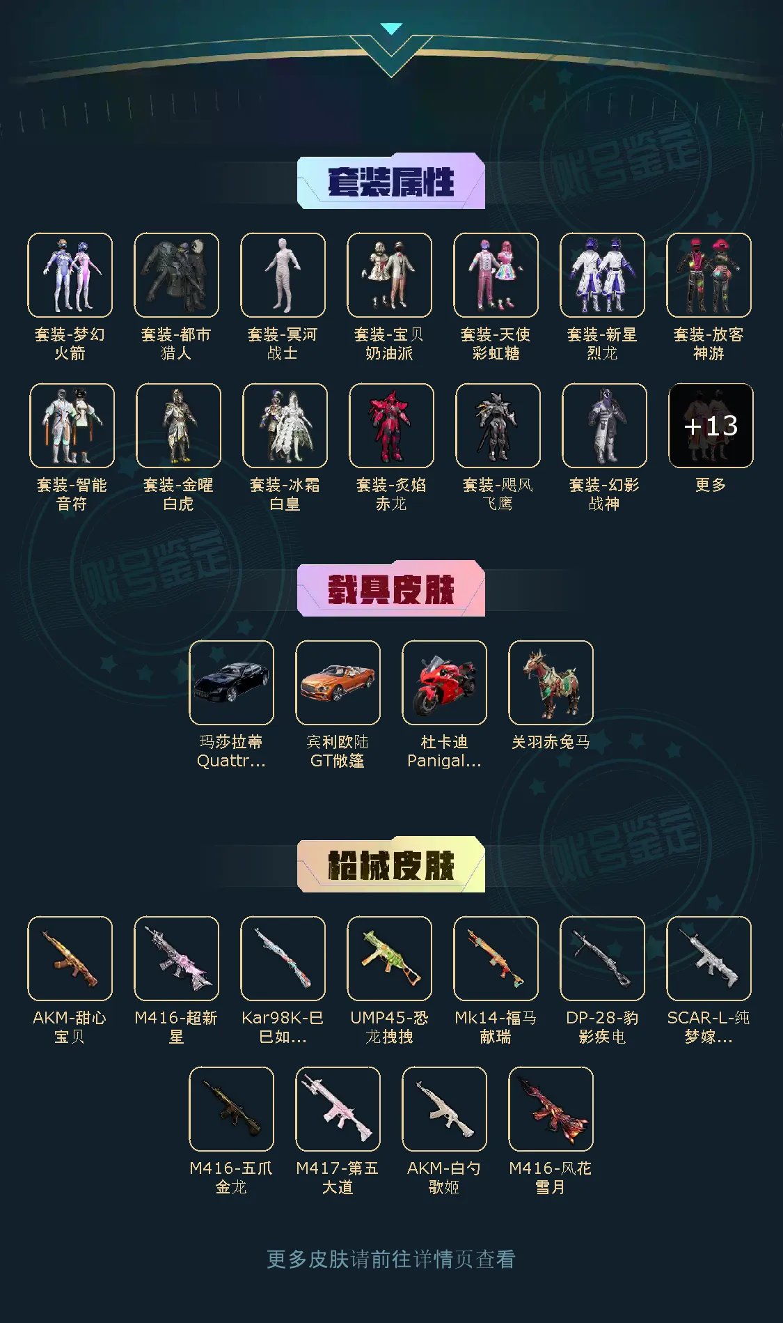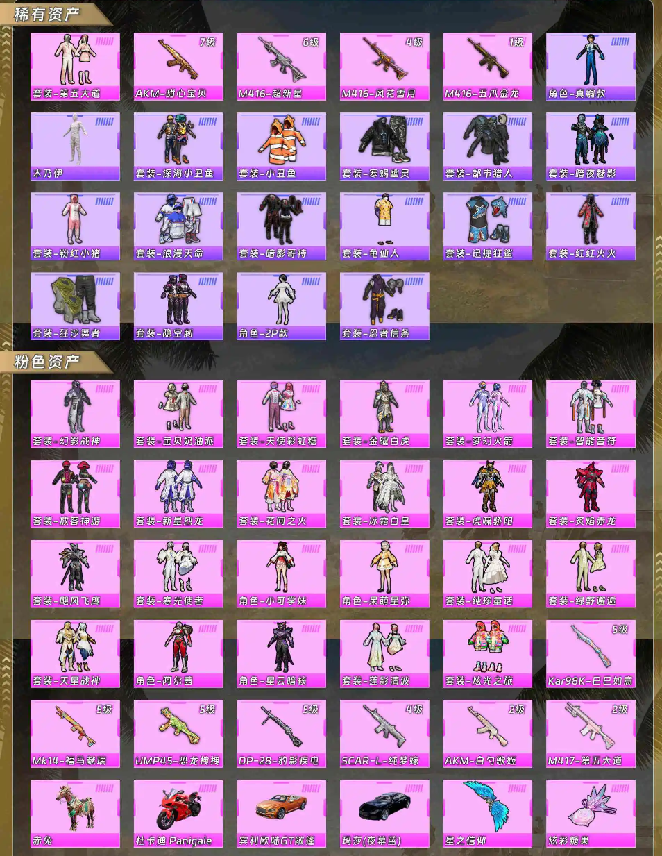 【粉色枪皮】M416-五爪金龙/AKM-甜心宝贝/AKM-白勺歌姬/SCAR-L-纯梦嫁纱/M416-风花雪月/M416-超新星/Kar98K-巳巳如意/M417-第五大道/UMP45-恐龙拽拽