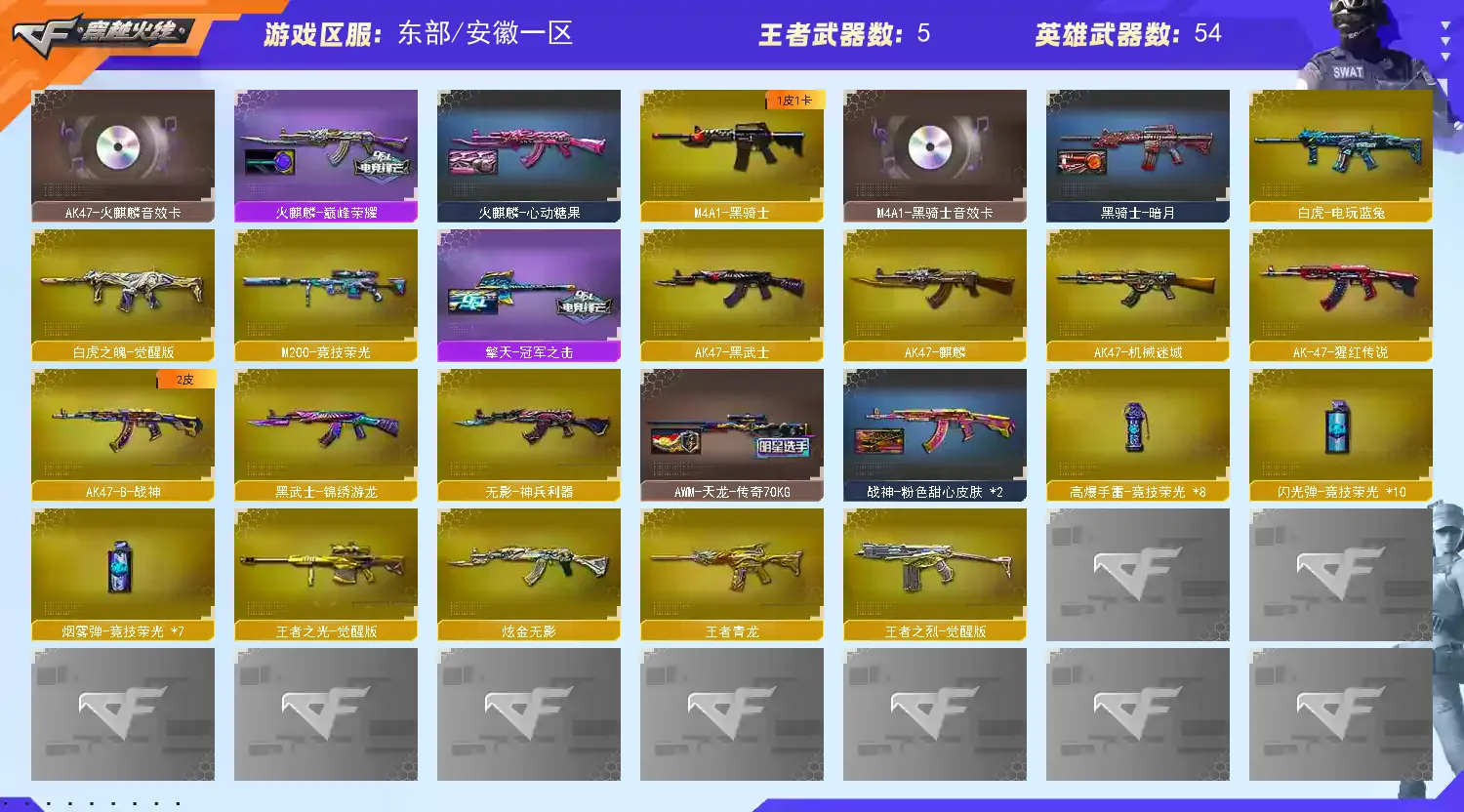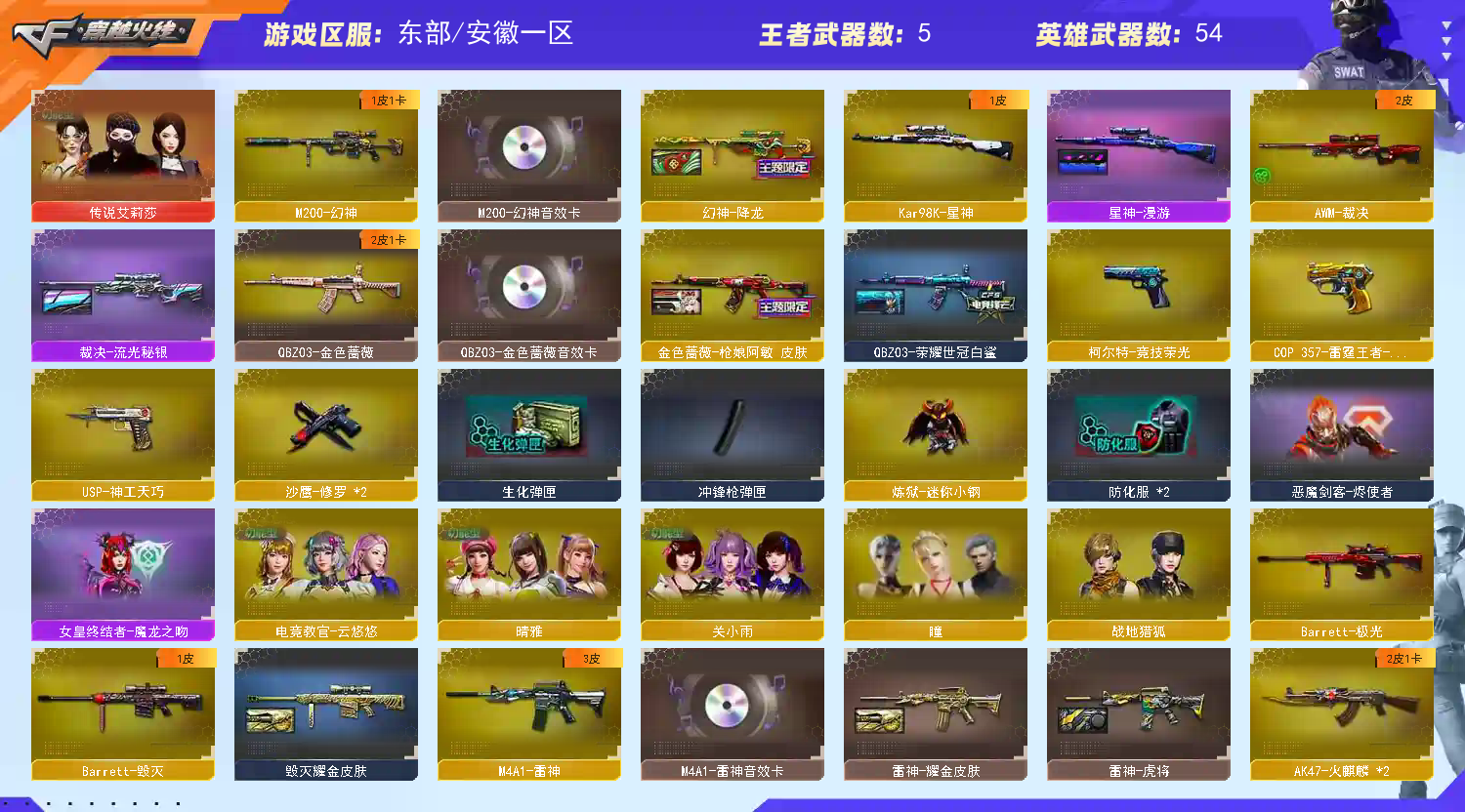 VIP5 【游戏等级】Lv.100 高阶大元帅 【V数量】63 【重要套装】竞技荣光套装 【重要角色】传说艾莉莎/_瞳/电竞教官-云悠悠/关小雨/_晴雅/灵动武士/樱-缤纷夏日 【英雄武器】_M200-幻神/M200-竞技荣光/ Barrett -毁灭/ Barrett -极光/王者之光-觉醒版/ Kar98K -星神/AWM-裁决/M4A1-雷神/M4A1-黑骑士/白虎-电玩蓝兔/白虎之魄-觉醒版/AK47-火麒麟(2)/无影-神兵利器/AK47-麒麟/AK47-黑武士/AK-47-猩红传说/AK47-机械迷城/AK47-B-战神/ QBZ03 -金色蔷薇/王者之烈-觉醒版/COP 357-雷霆王者-觉醒版/沙鹰-修罗(2)/柯尔特-竞技荣光/USP-神工天巧/麒麟刺/龙啸/擎天/擎天-竞技荣光(2)/屠龙/高爆手雷-竞技荣光(8)/烟雾弹-竞技荣光(7)/闪光弹-竞技荣光(10)/黑武士-锦绣游龙 【王者武器】王者青龙 【小人枪】M4A1-雷神-精英刀锋/ C.A.T/AWM -灵狐-15周年嘉年华/裁决-雪莉杨/炼狱-迷你小钢/COP-白鲨/迷你深渊冰龙/迷你牛牛/魔能飞环-曼陀罗/冰火魔兽/烟雾弹- Orange -虎牙娘 【其他重要武器】炫金无影/炫金修罗/红龙AK47/M4A1-S-能量核心/AK47-轮回/M4A1-秘银赤龙(2)/雷神-赛博幻想/98K-烛龙/M200-庆典-CFS 2021/AWM-黑金/AWM-卡通(2)/ Barrett -孔明/KAC-情人节2021/Spas-12-幻能朋克/Colt1911-彩蝶/沙鹰-枪王排位(2)/新USP-枪王排位奖励(3)/愤怒公牛左轮-枪王排位/USP-黑大圣/Anaconda-雷电核心/ Cop357 -赤龙/金刚伞-电玩红兔/雷神之怒-机甲核心/ Laser Sword -夏日/蝴蝶刀-枪王排位/尼泊尔军刀-9周年/尼泊尔军刀-战龙/闪光弹-枪王排位(2) 【重要武器皮肤】幻神-降龙/星神-漫游/毁灭耀金皮肤/AWM-天龙-传奇70KG/AWM-天龙-传奇白鲨/裁决-流光秘银/火麒麟-巅峰荣耀/火麒麟-心动糖果/火麒麟-枪娘凯特琳/M4A1-千变-孔明皮肤/雷