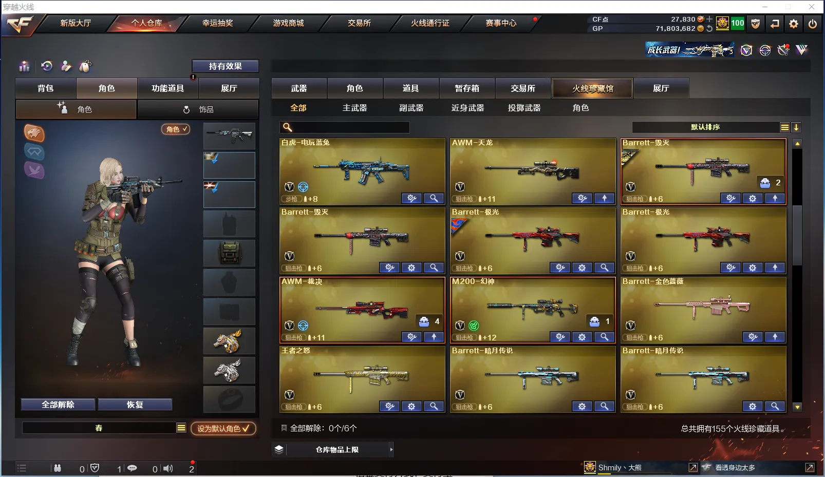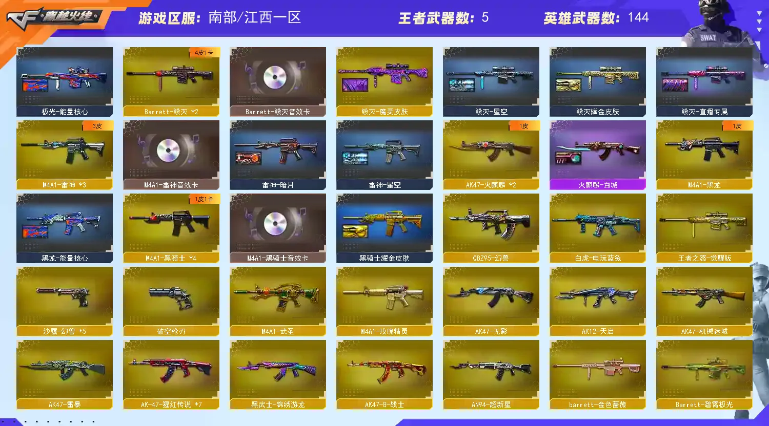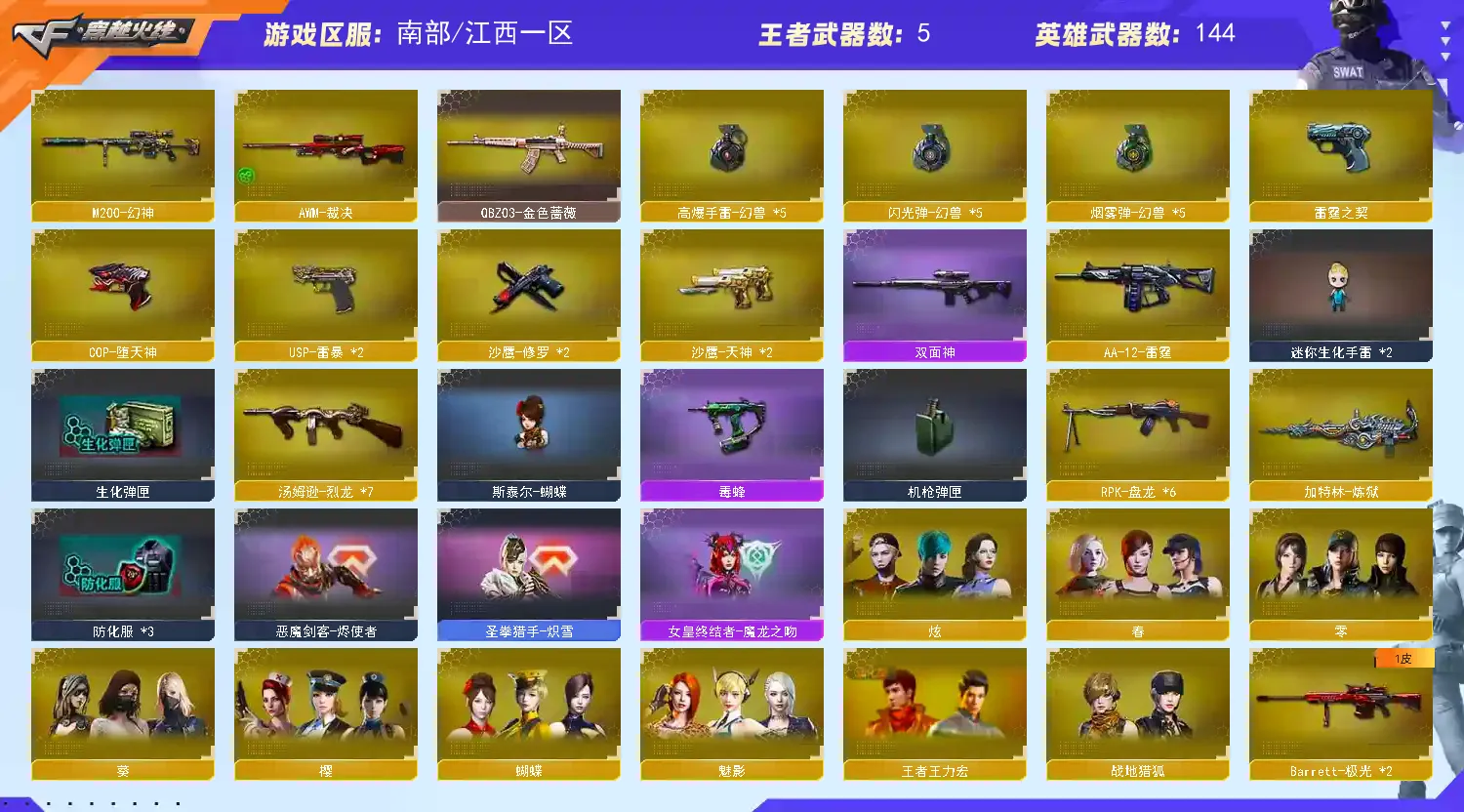 【主武】:M200幻神、盘龙X6+炼狱、烈龙X7+斯泰尔蝴蝶、王者之翼、王者之怒、王者之魄、王者之幻、超新星悦享、火麒麟X2(百城、雷神)、黑龙(能量核心)、雷神X3(音效卡、暗月、星空)、黑骑士X4(音效卡、耀金)、无影、死神、天启、超新星、毁灭X2(音效卡、魔灵、星空、直播专属)、极光X2(能量核心)、裁决、巴雷特暗月传说X2、巴雷特金色蔷薇、雷暴、雷霆、黑武士锦绣游龙、玫瑰精灵、QBZ95幻兽、QBZ03金色蔷薇、猎神、烈火、猩红传说X7(老兵传说)、AKB战士、白虎电玩蓝兔、炫金黑龙、炫金雷神、炫金骑士、炫金武士、炫金毁灭、炫金天龙、机甲撕裂者3、激光毁灭者3白马银枪、末日审判者3、双面神、深渊巨龙咆哮3、毒蜂、乱世超越、神圣爆裂者3、试炼破坏者3、征服超越者3、死亡之眼等活动武器