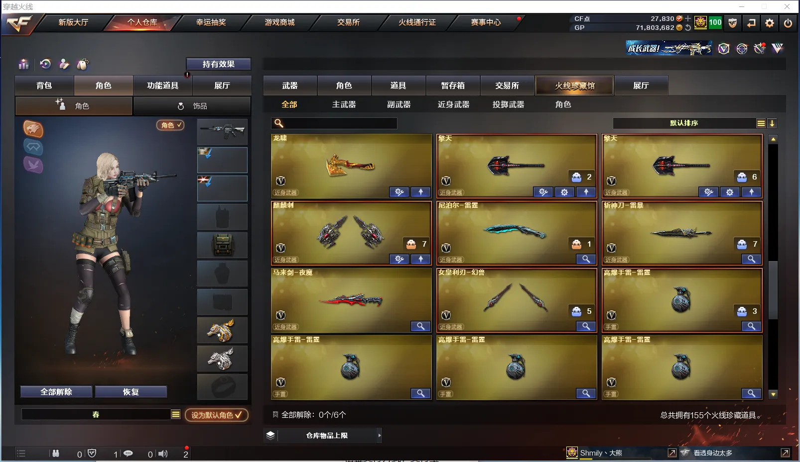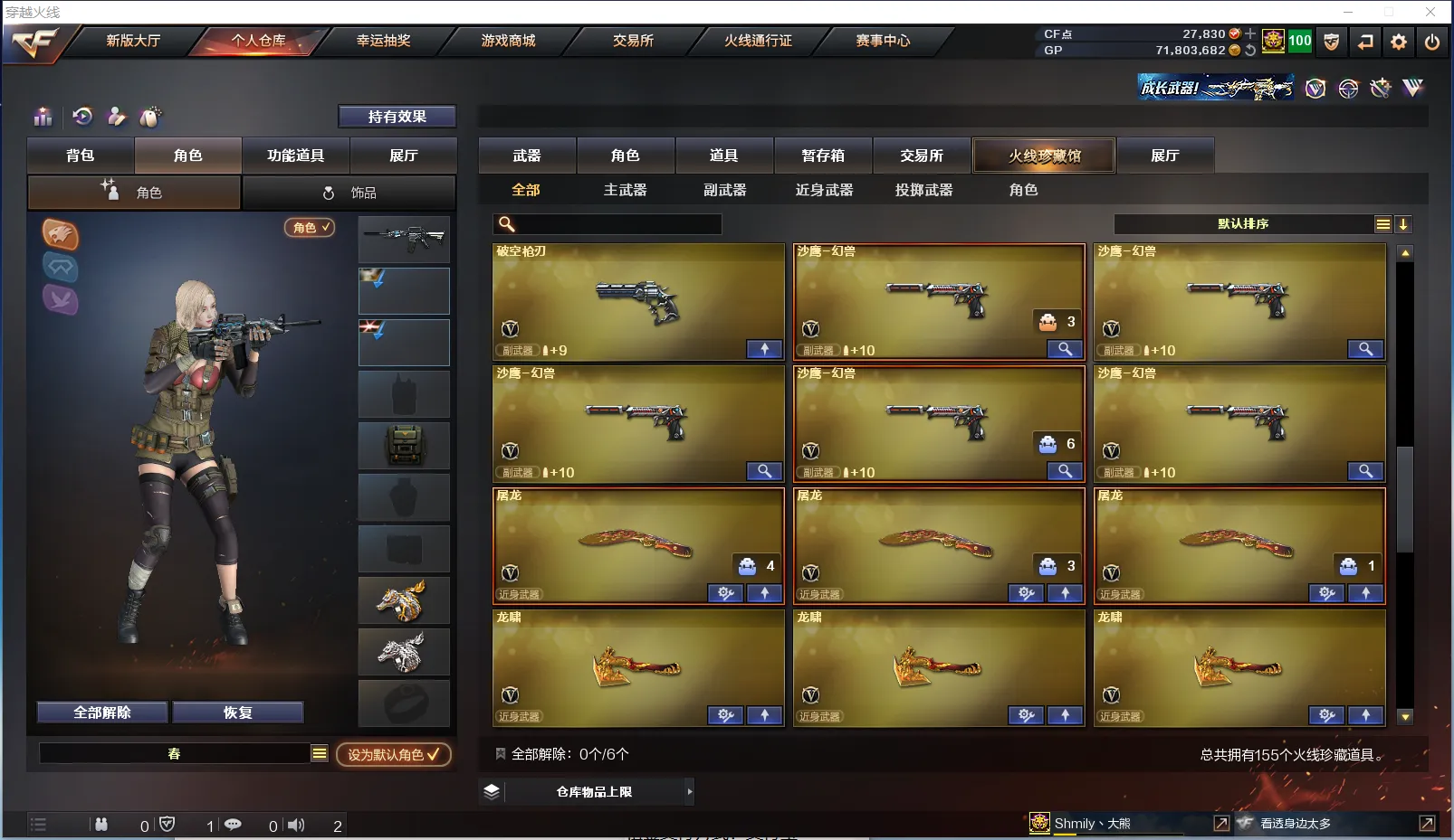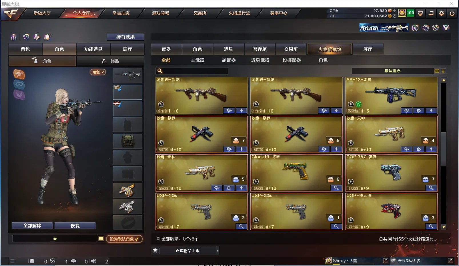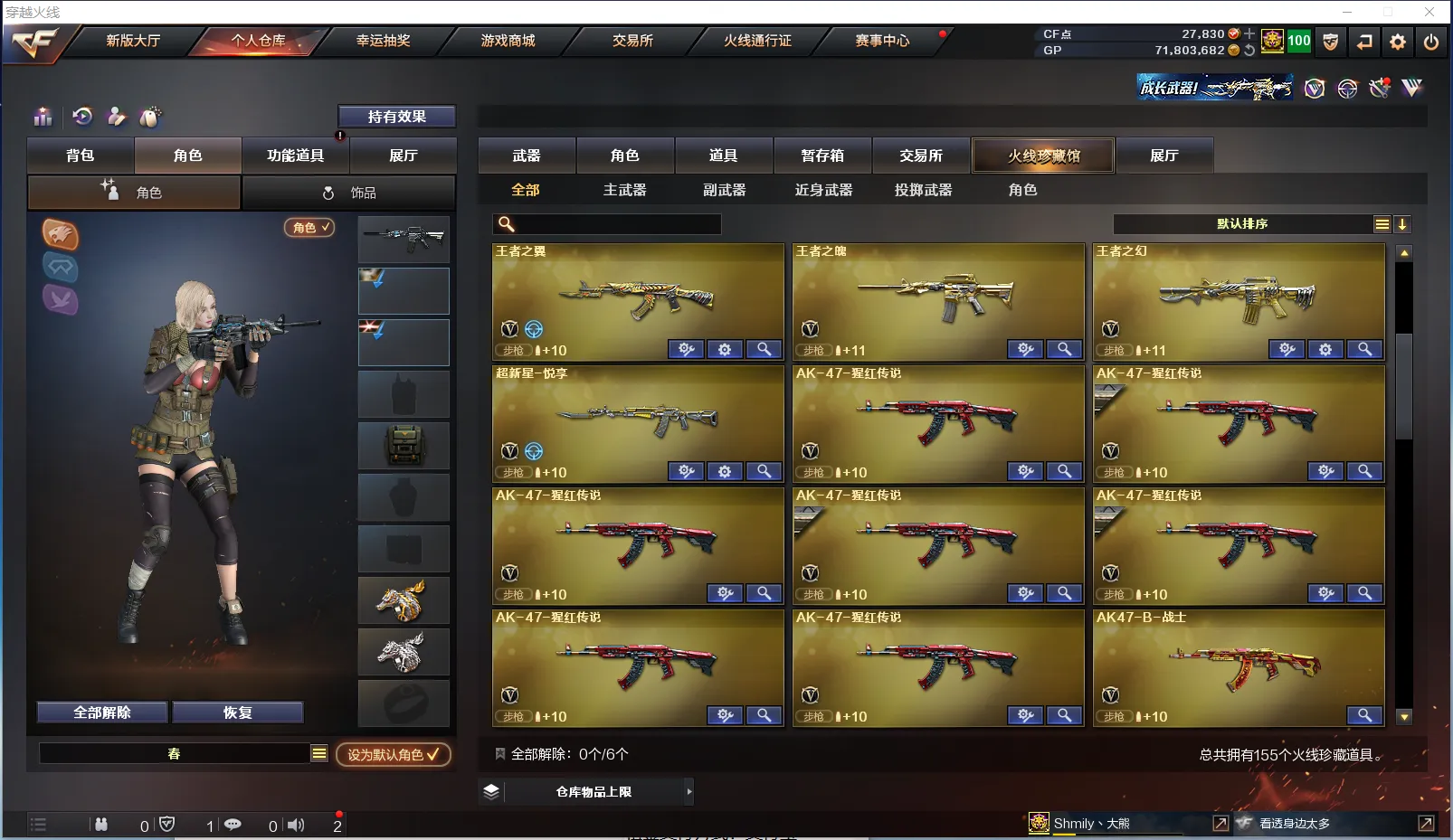 【主武】:M200幻神、盘龙X6+炼狱、烈龙X7+斯泰尔蝴蝶、王者之翼、王者之怒、王者之魄、王者之幻、超新星悦享、火麒麟X2(百城、雷神)、黑龙(能量核心)、雷神X3(音效卡、暗月、星空)、黑骑士X4(音效卡、耀金)、无影、死神、天启、超新星、毁灭X2(音效卡、魔灵、星空、直播专属)、极光X2(能量核心)、裁决、巴雷特暗月传说X2、巴雷特金色蔷薇、雷暴、雷霆、黑武士锦绣游龙、玫瑰精灵、QBZ95幻兽、QBZ03金色蔷薇、猎神、烈火、猩红传说X7(老兵传说)、AKB战士、白虎电玩蓝兔、炫金黑龙、炫金雷神、炫金骑士、炫金武士、炫金毁灭、炫金天龙、机甲撕裂者3、激光毁灭者3白马银枪、末日审判者3、双面神、深渊巨龙咆哮3、毒蜂、乱世超越、神圣爆裂者3、试炼破坏者3、征服超越者3、死亡之眼等活动武器