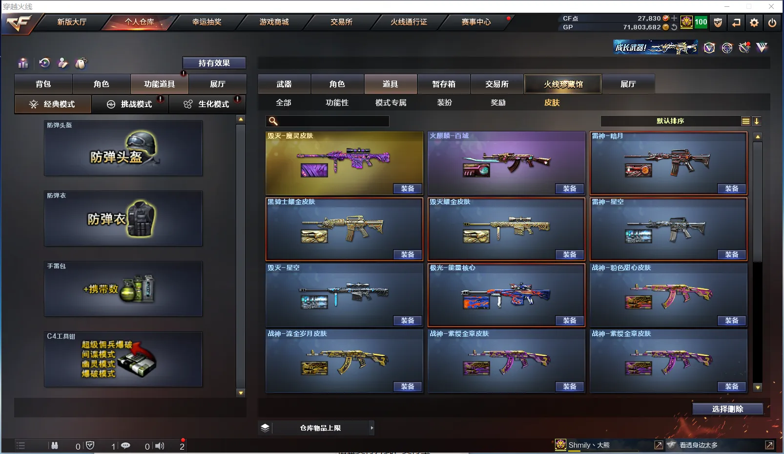 【道具】:雷神音效卡、黑骑士音效卡、毁灭音效卡、小兔姬玩偶、孙悟空玩偶、暴躁猪玩偶、审判者玩偶、小红玩偶、金色幸运鼠玩偶、终结者玩偶、关羽玩偶、铁骑玩偶、波特博士红色玩偶、夏日水手玩偶、裂空之翼红色玩偶、超能少女玩偶、15周年玩偶、14个背包、超级背包、防弹背包、炫彩背包、AC(防弹头盔+防弹衣)、C4工具钳、手雷包、防化服、夺命之镰、迷雾幽灵、变异宝贝、灵魂忍者