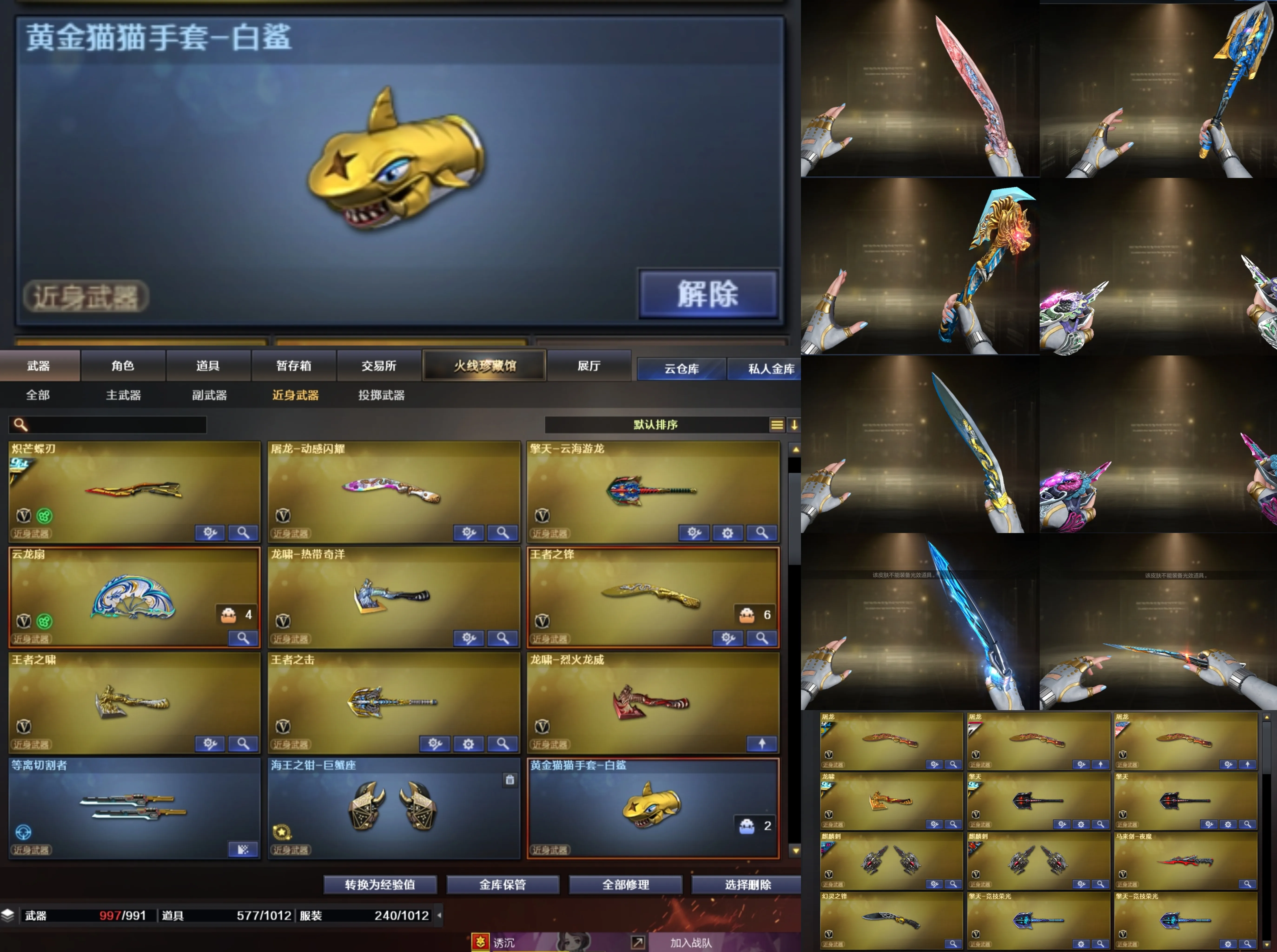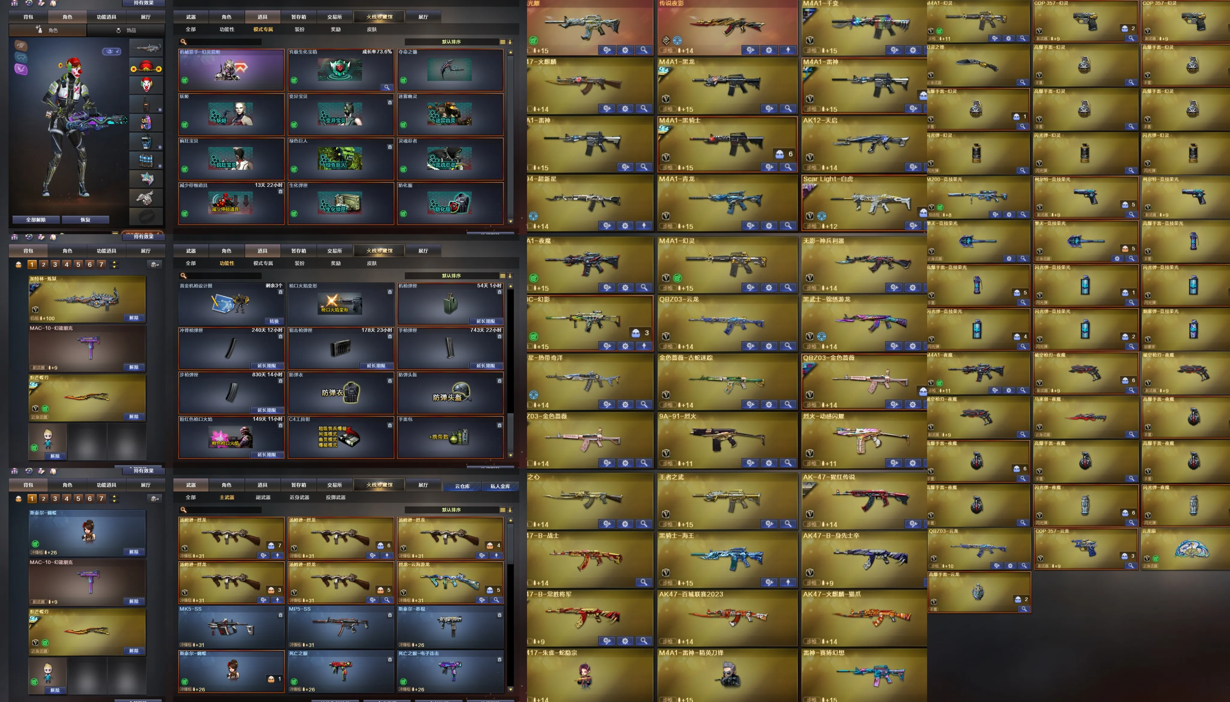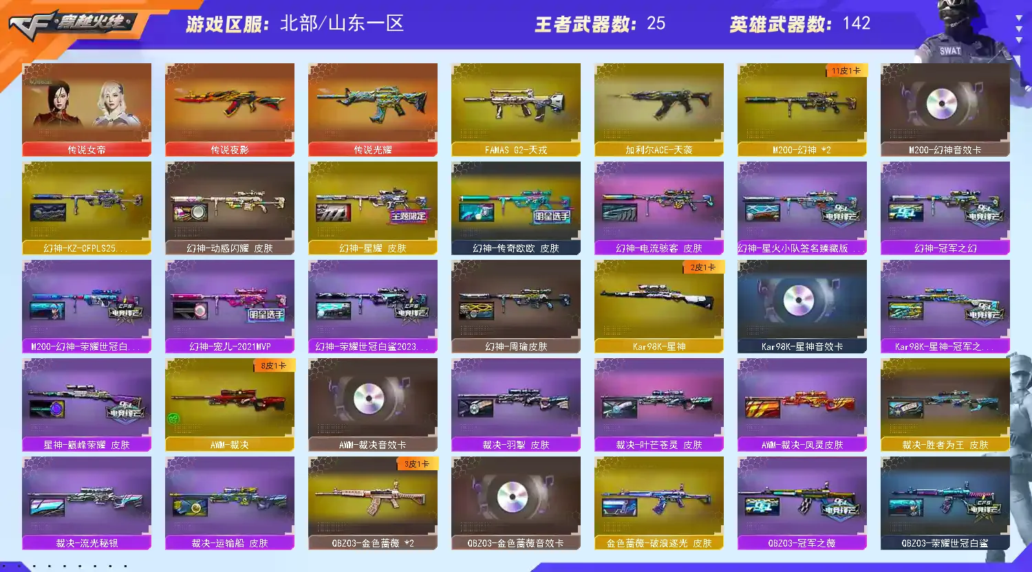2.本账号喜欢收集各种角色和【经典武器装备】,共有200多个角色(21个四防角色):18个英雄级自定义属性角色,10个王者角色,150多个普通或三防角色。各种弹夹道具装备齐全,每月都会做积分活动领角色、装饰品或者经典收藏武器,9个粉色烟雾(最强烟雾),8个紫色烟雾,各种散弹喷子冲锋枪。角色头饰、面饰、肩饰、背饰、腰饰、腿饰品丰富,满足您的个性化角色装扮需求。