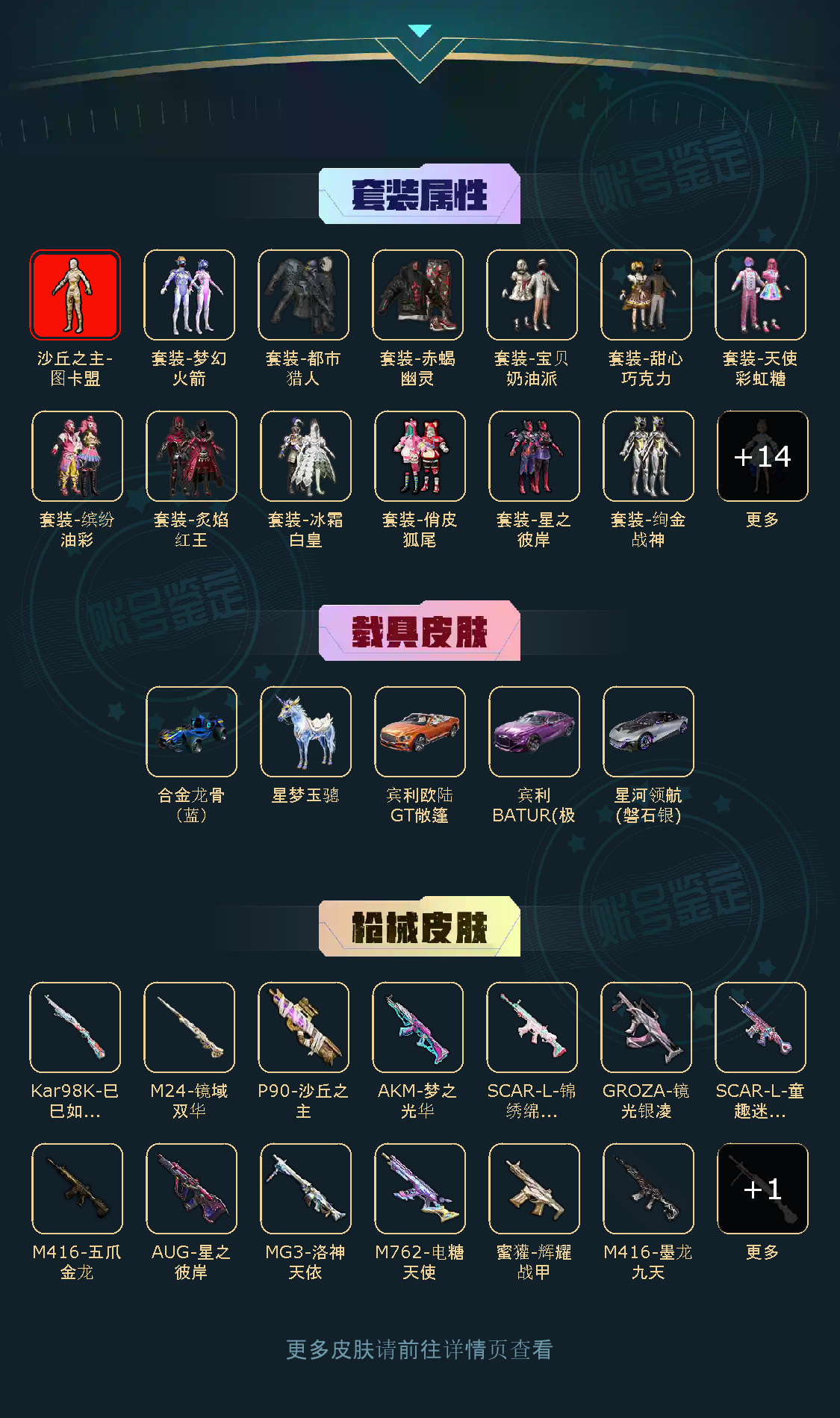 【粉色枪皮】M416-五爪金龙/AKM-梦之光华/SCAR-L-锦绣绵绵/SCAR-L-童趣迷兔/M416-墨龙九天/GROZA-镜光银凌/AUG-星之彼岸/M762-电糖天使/蜜獾-辉耀战甲/Kar98K-巳巳如意/M24-镜域双华/P90-沙丘之主/DP-28-千金淑猫/MG3-洛神天依