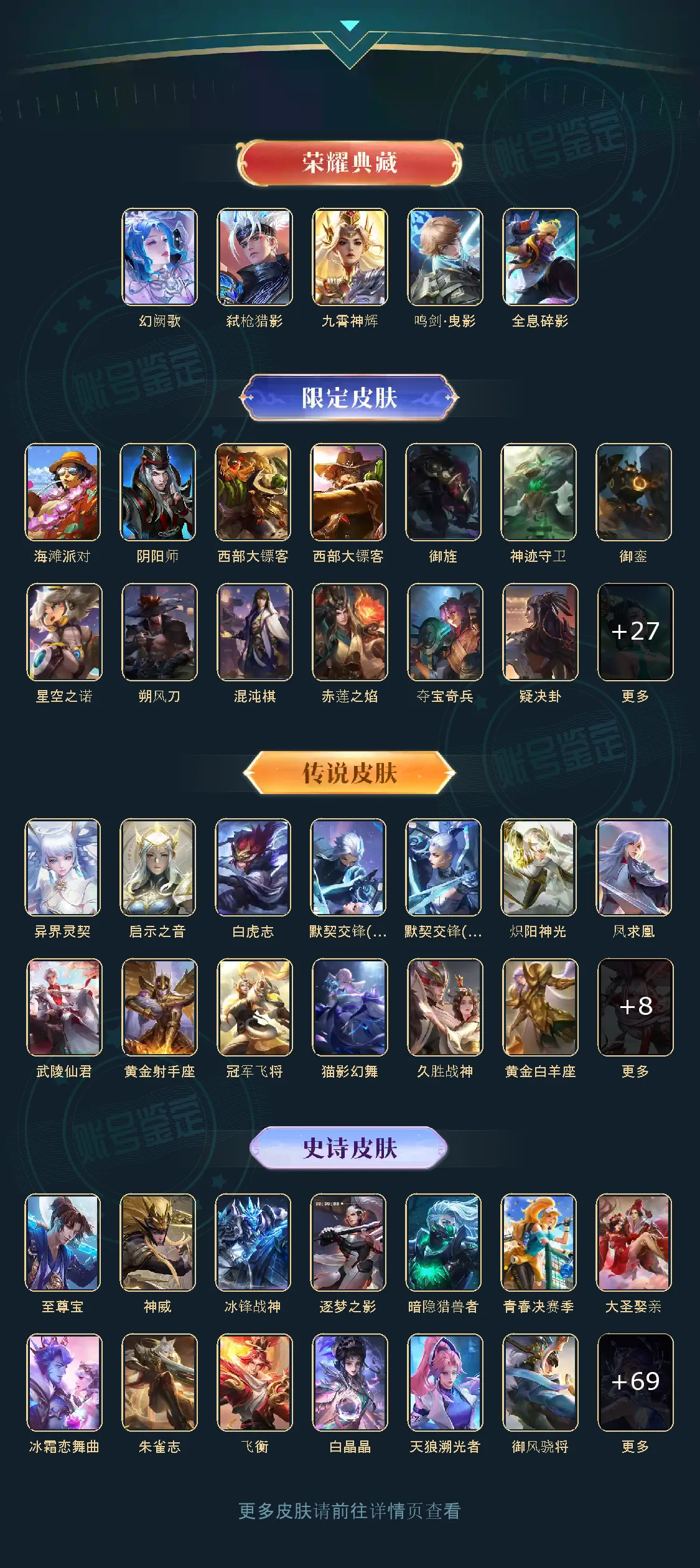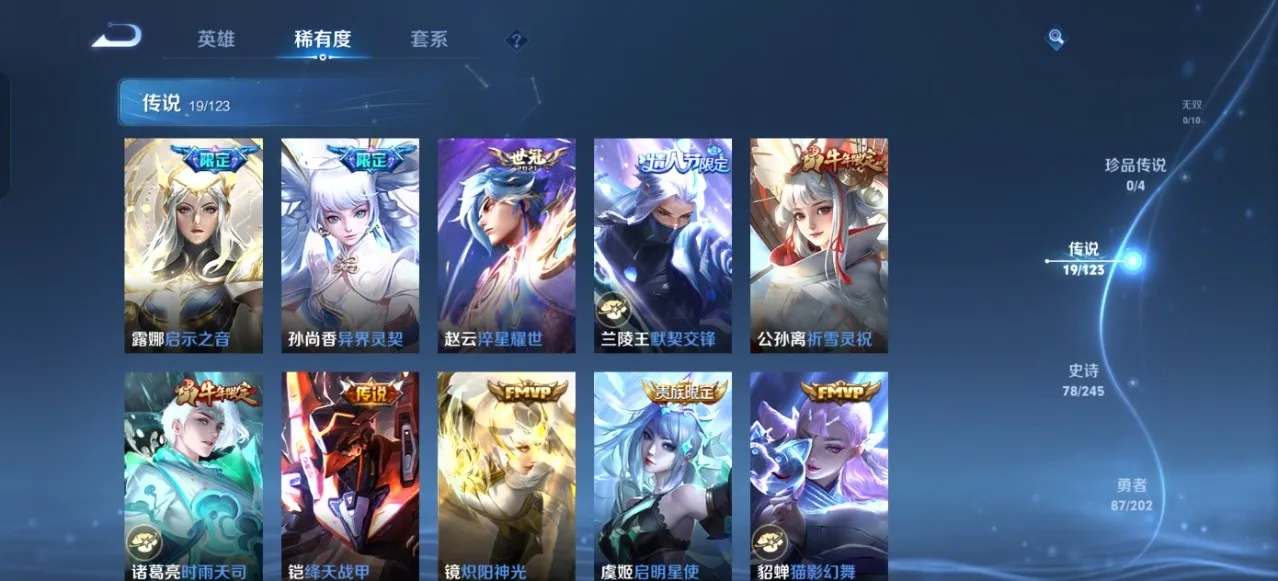 贵族等级V8,英雄数量121,典藏皮肤数5,皮肤数量228,凤求凰/全息碎影/白虎志/久胜战神/异界灵契/启示之音