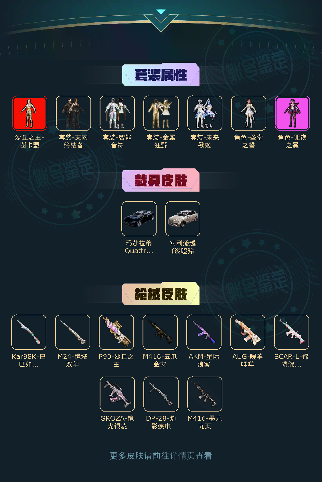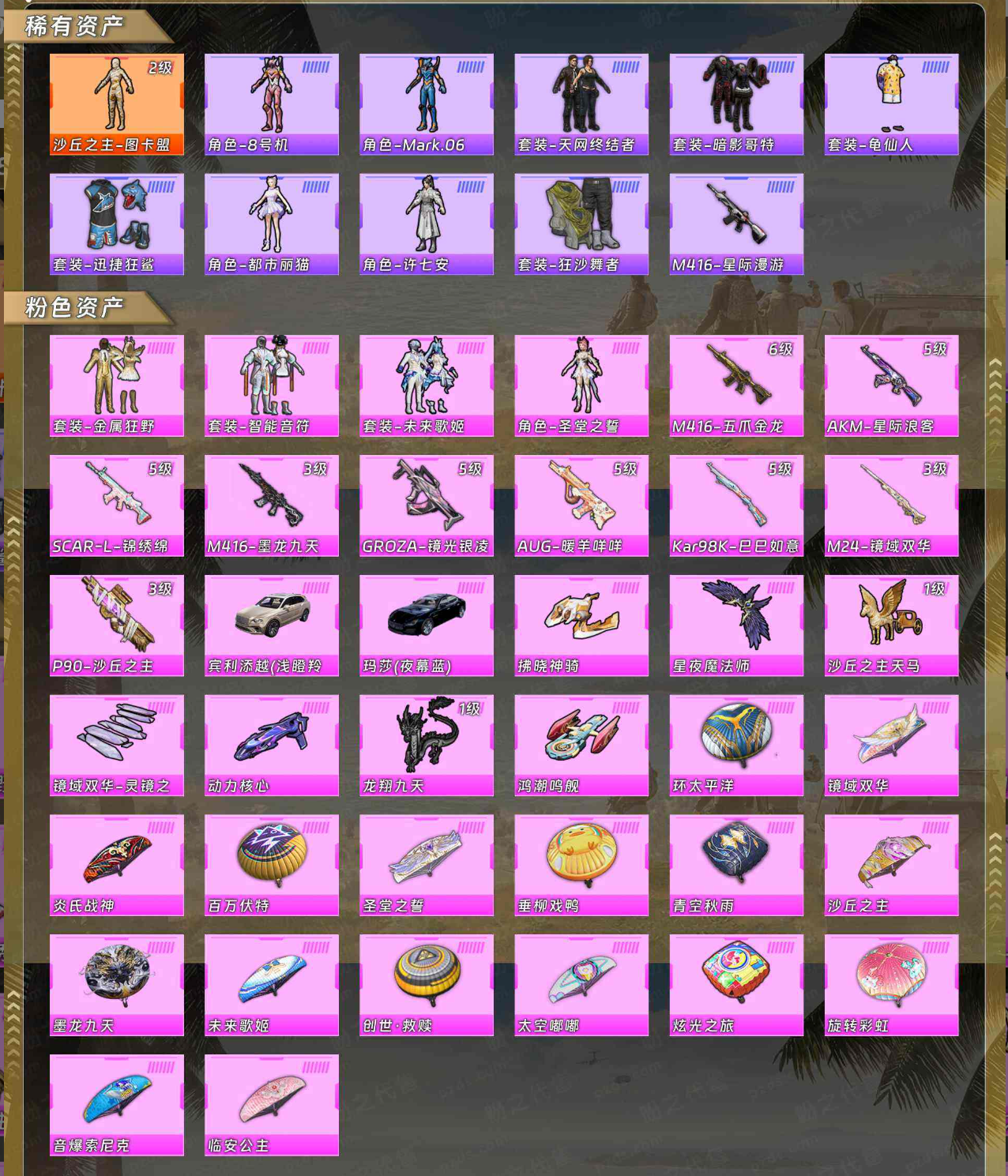 【稀有资产】沙丘之主-图卡盟[2级]/角色-8号机/角色-Mark.06/套装-天网终结者/套装-暗影哥特/套装-龟仙人/套装-迅捷狂鲨/角色-都市丽猫/角色-许七安/套装-狂沙舞者/M416-星际漫游