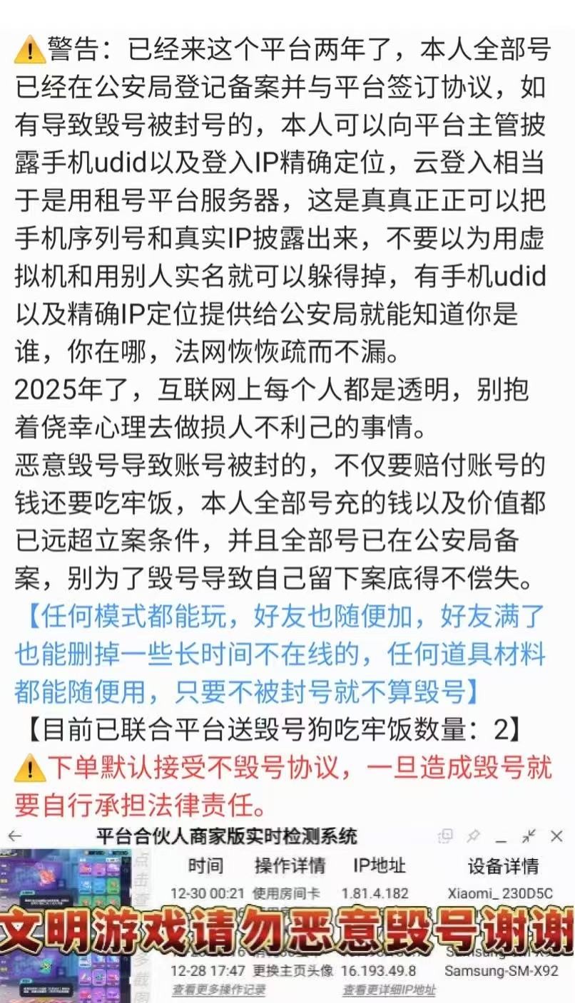 无理由投诉撤单拉黑!连续投诉撤单自动拉黑!不要故意投诉撤单,不要故意投诉撤单!! 所有商品会不定期限时特惠~ 收藏店铺不会迷路呦!! 进入游戏若卡,进入设置里帧率选择高帧率,就不会卡了,只首次需要调以后都不会卡。 若出现黑屏,卡顿等问题,可后台关闭租号玩,重新进入租号玩即可,若进度条卡住不动,退掉租号玩,先打开官服蛋仔派对,更新完以后重新进入租号玩即可。有任何问题首页右上角找客服,输入转人工,客服会迅速帮忙处理。 ★祝愿宝子们天天开心 ★多次好评会单独自动发放店铺红包~ 提醒:本店铺所有号都交易凭证,若使用账号进行诈骗,违禁词,或使用第三方外挂导致账号被封,将依据损失通过ip,充值记录,手机号及或其他付款记录等信息,报警并亲自配合警察根据《刑法》第二百七十五条及二百六十六条,对违法者处三年以下有期徒刑,拘留及罚金。