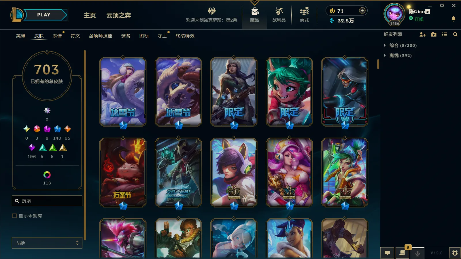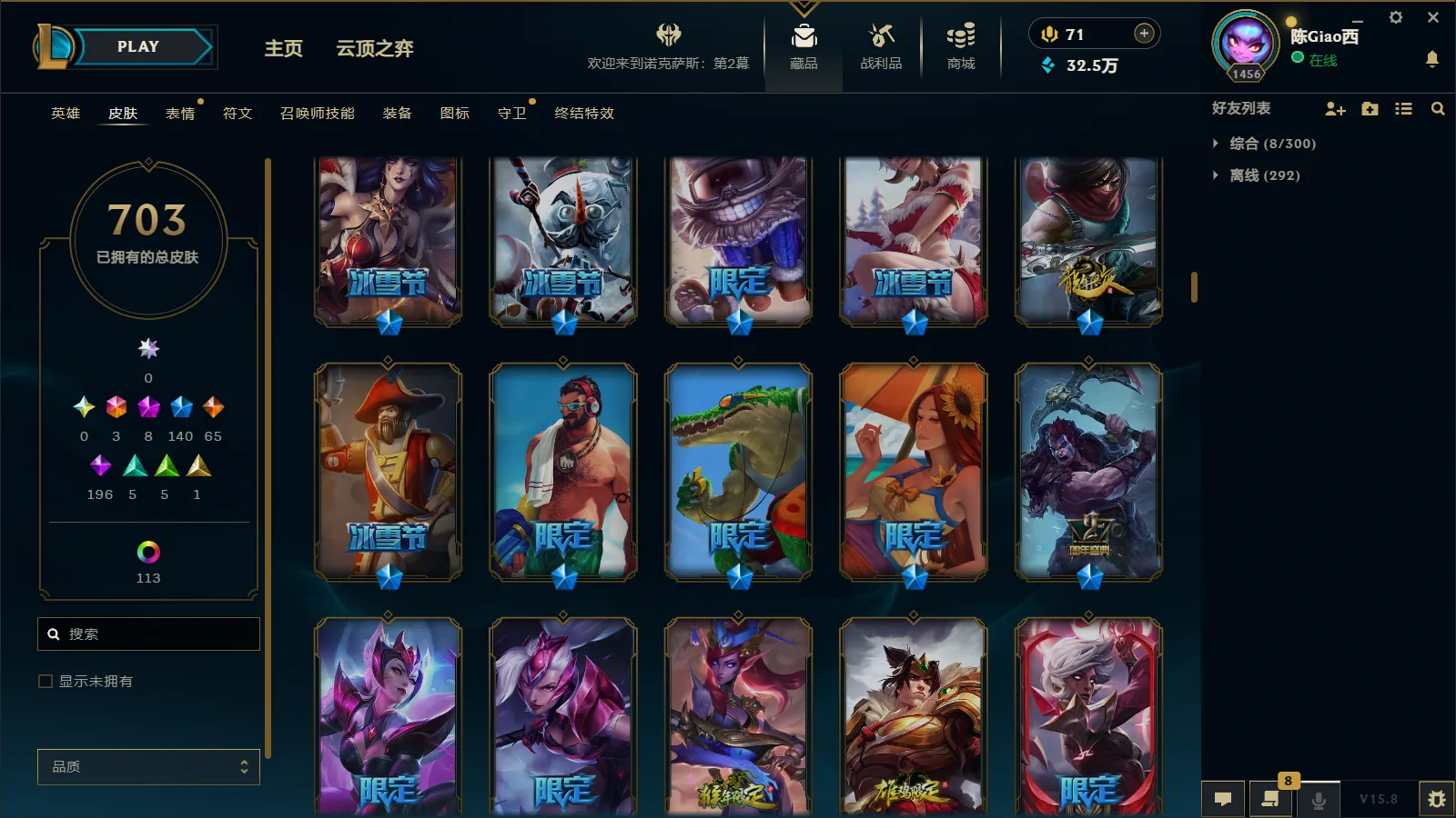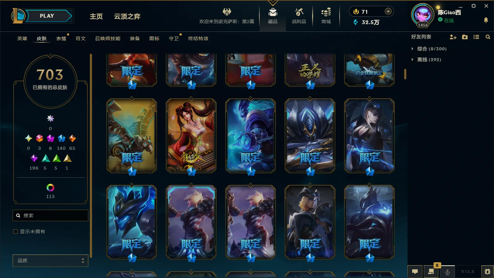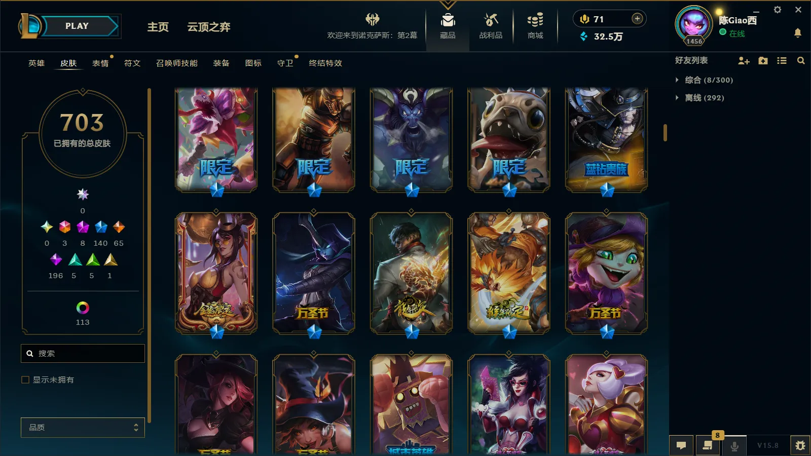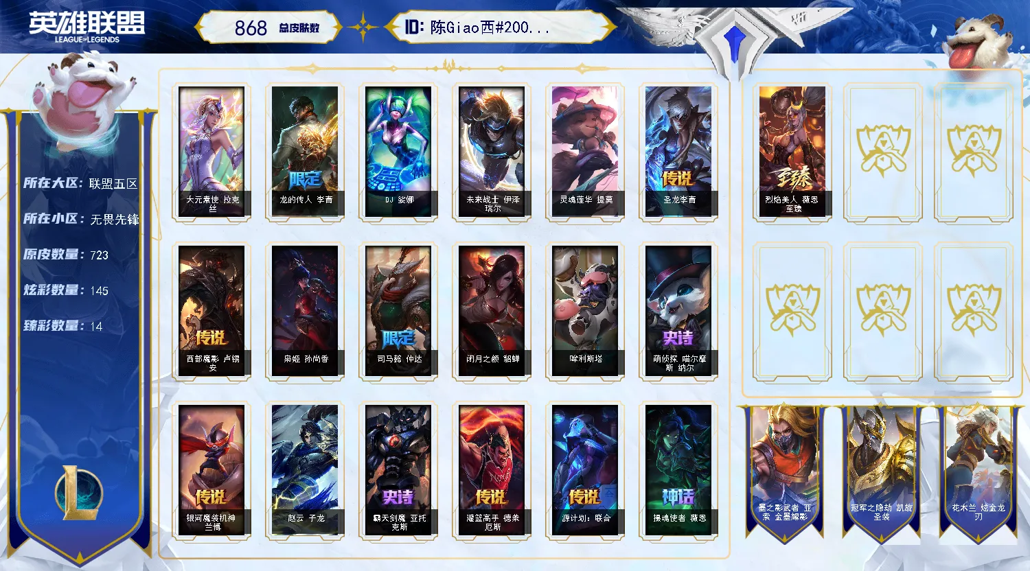 900皮肤多限定可排位全英雄黑龙瞎龙刀龙猴摄魂薇恩冰原狙击黎明瑞雯冠军劫冠军螳螂西部魔影卢锡安克格汪地底世界广寒仙子卧虎藏龙等各种