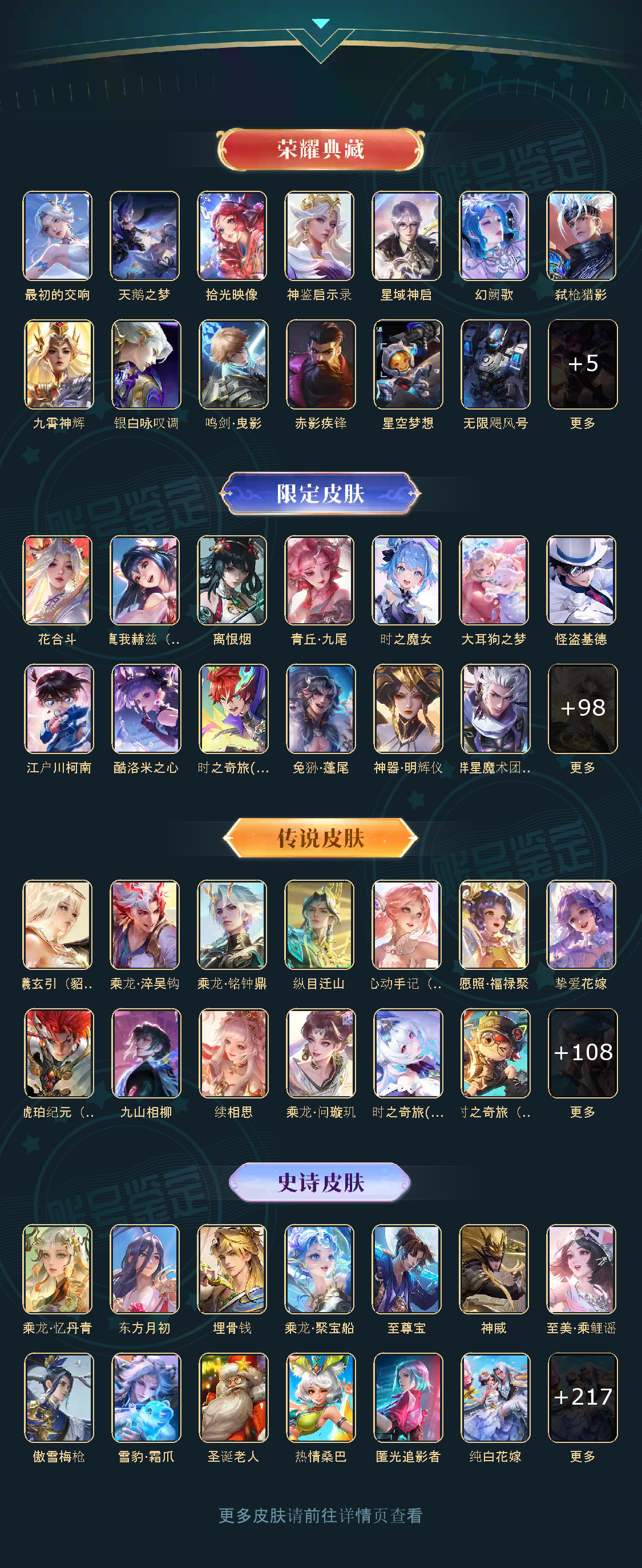 贵族等级V10,英雄数量123,典藏皮肤数16,皮肤数量650,纯白花嫁/天魔缭乱/至尊宝/真爱至上/圣诞老人/热情桑巴/梅西/青龙志/白虎志/朱雀志/久胜战神/飞衡/匿光追影者/鸣剑·曳影/星域神启/李逍遥/武圣/玉兔公主/补天/异界灵契/神威/启示之音/傲雪梅枪/时雨天司
