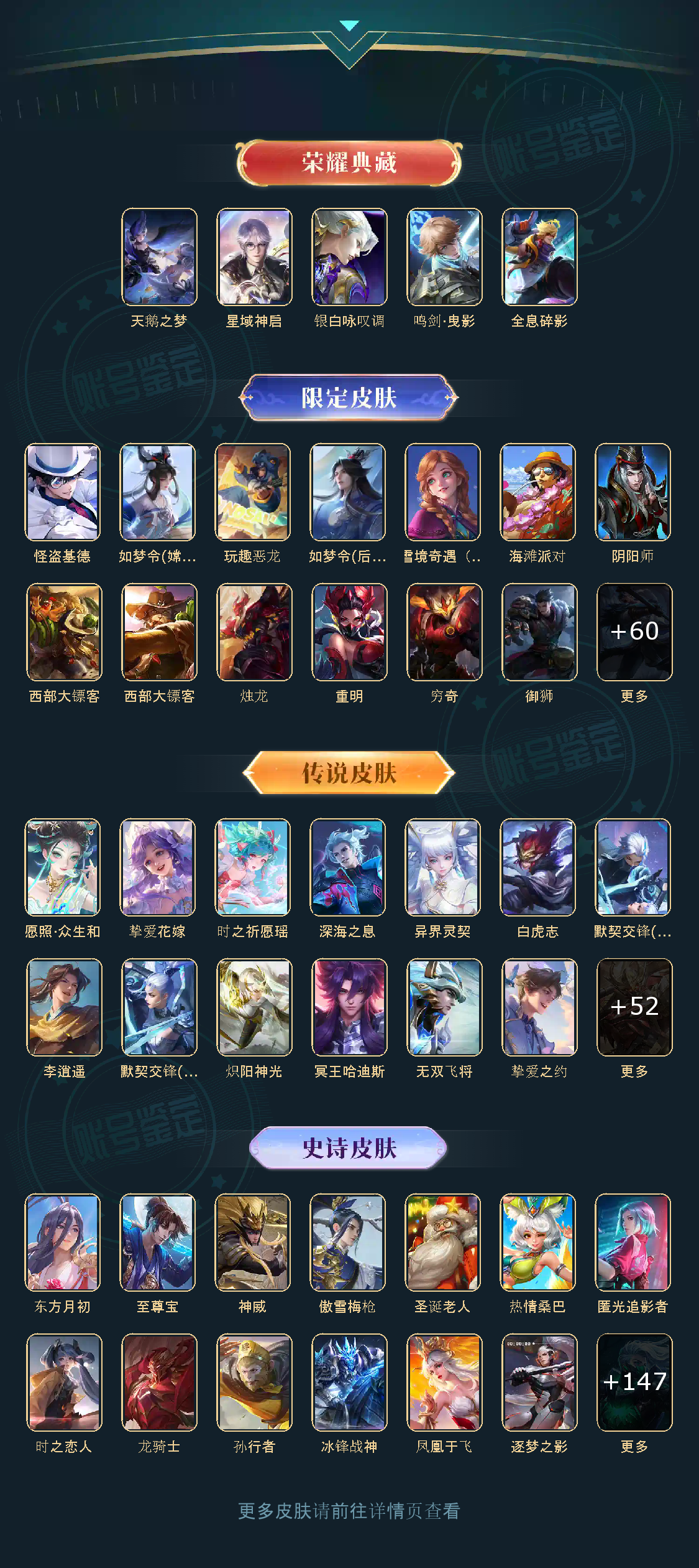 贵族等级V10,英雄数量122,典藏皮肤数5,皮肤数量464,冰锋战神/街头霸王/天鹅之梦/至尊宝/圣诞老人/凤求凰/热情桑巴/逐梦之影/武陵仙君/黄金狮子座/全息碎影/大圣娶亲/冰霜恋舞曲/青龙志/白虎志/朱雀志/太华/久胜战神/飞衡/梁祝/白鹤梁神女/匿光追影者/鸣剑·曳影/星域神启/李逍遥/奔雷神使/孙行者/玉兔公主/异界灵契/神威/傲雪梅枪/淬星耀世/时雨天司
