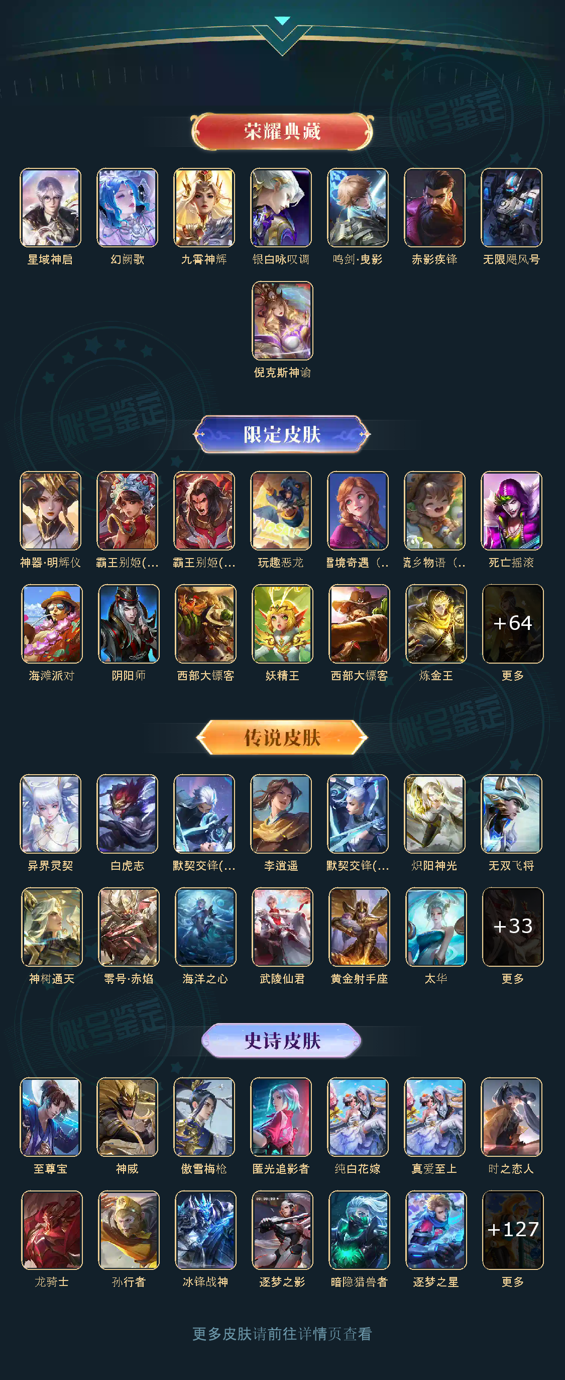 贵族等级V10,英雄数量124,典藏皮肤数8,皮肤数量433,无限飓风号/鸣剑·曳影/星域神启