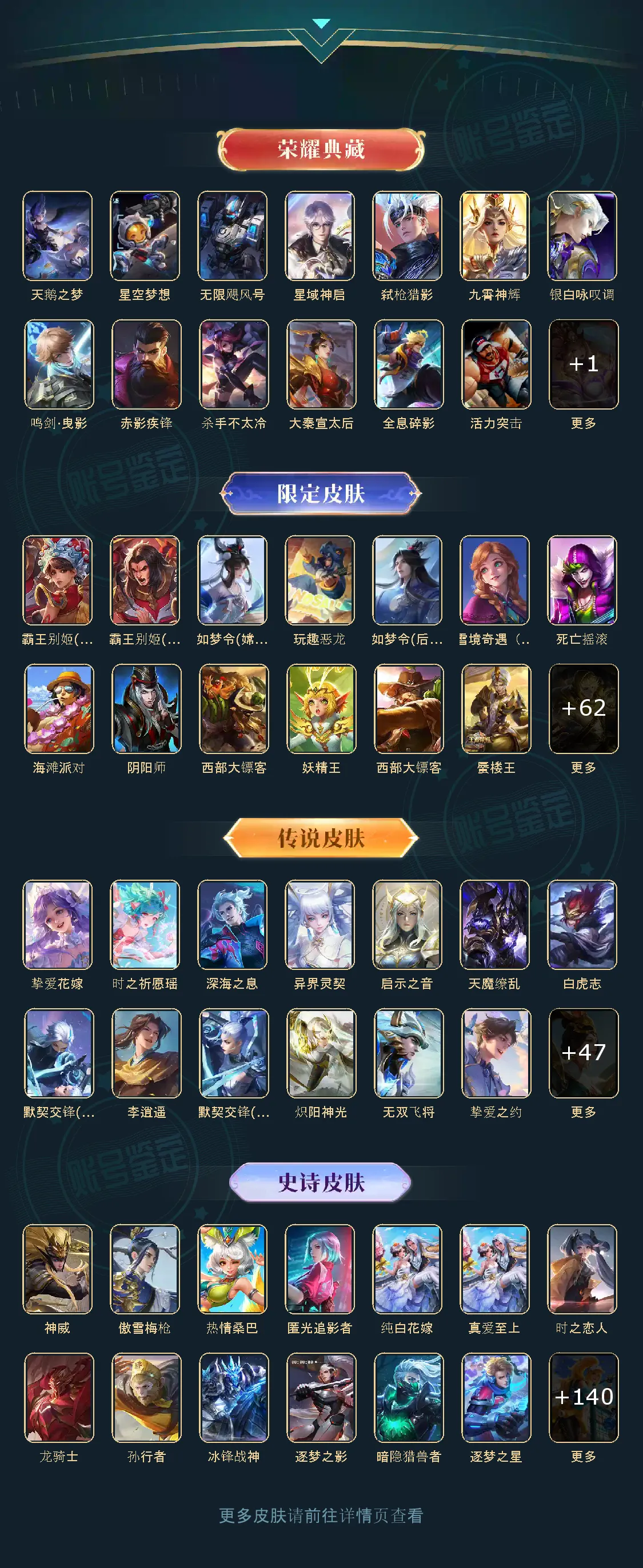 天鹅之梦,星空梦想,无限飓风号,鸣剑·曳影,赤影疾锋,星域神启,弑枪猎影,九霄神辉,银白咏叹调,天魔缭乱,白虎志,默契交锋(兰陵王),李逍遥,默契交锋(花木兰),零号·赤焰,炽阳神光,热情桑巴,神威,纯白花嫁,真爱至上,匿光追影者,无双飞将,时之祈愿瑶,挚爱之约,挚爱花嫁,深海之息,补天,异界灵契,启示之音,傲雪梅枪