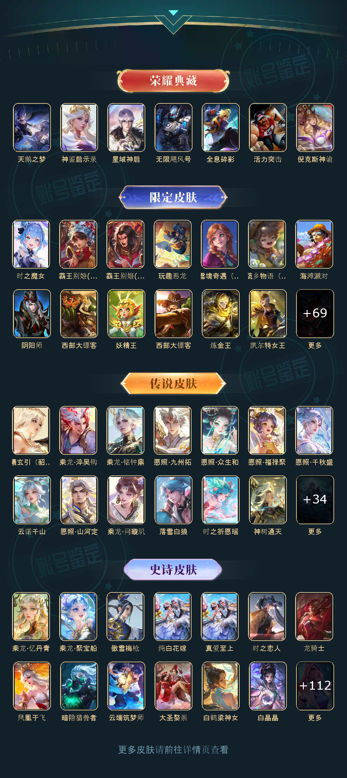 贵族等级V10,英雄数量124,典藏皮肤数6,皮肤数量431,