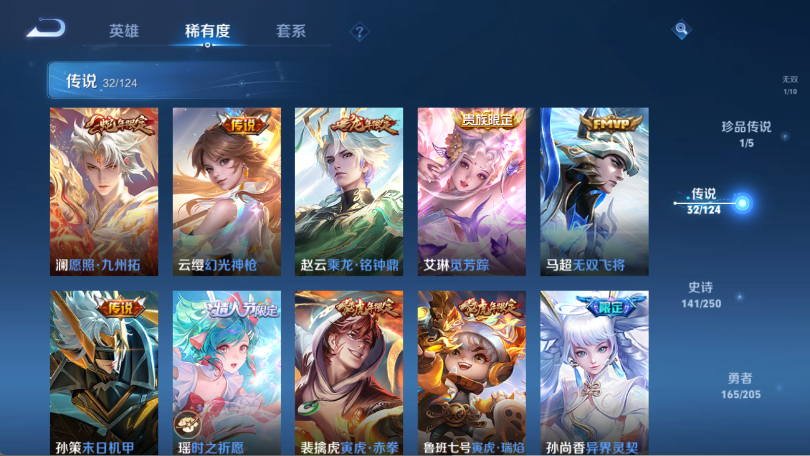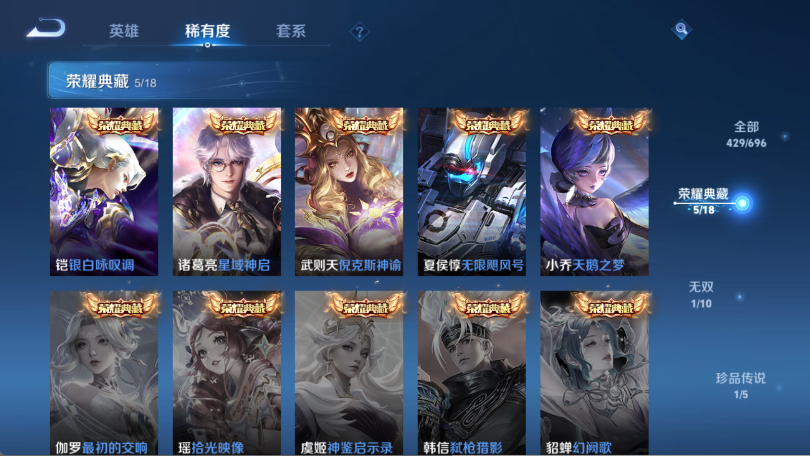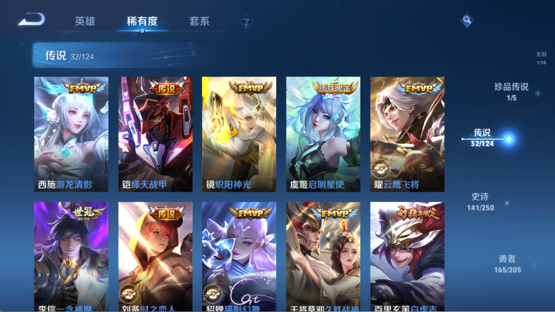 贵族等级V10,英雄数量124,典藏皮肤数5,皮肤数量429,
