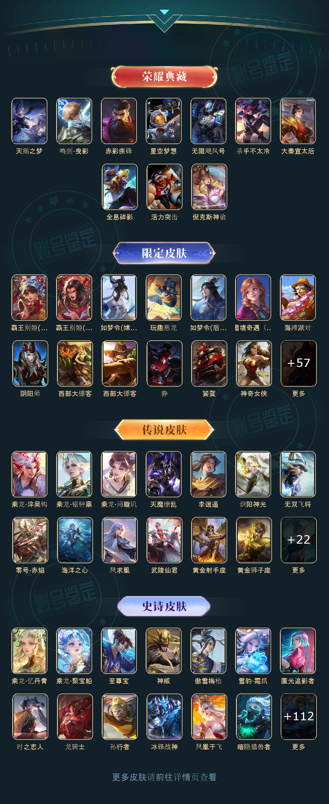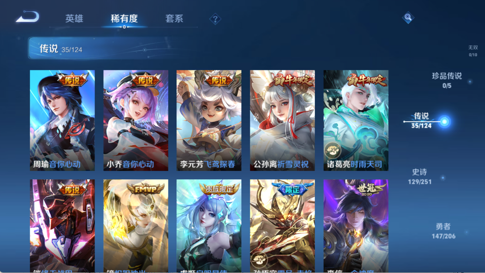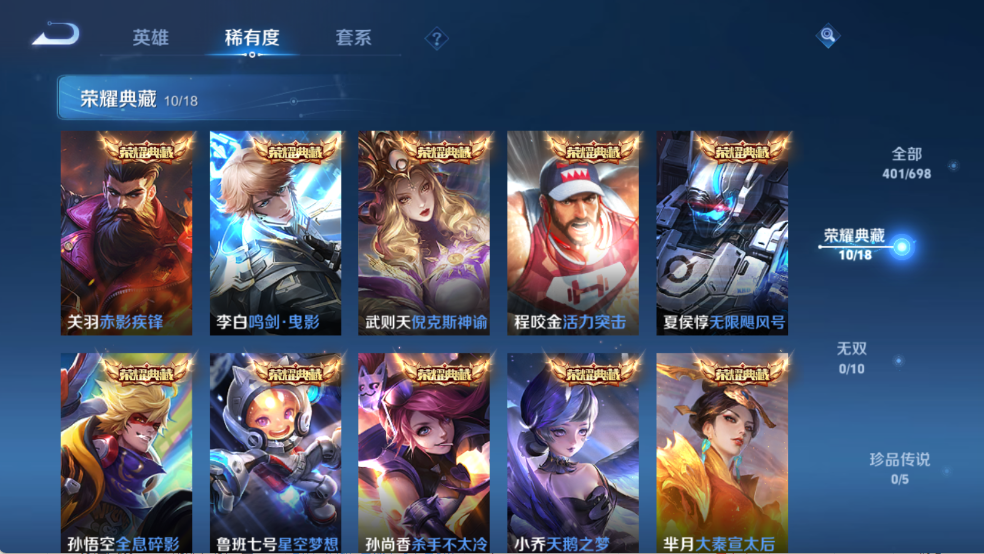 贵族等级V10,英雄数量125,典藏皮肤数10,皮肤数量401,