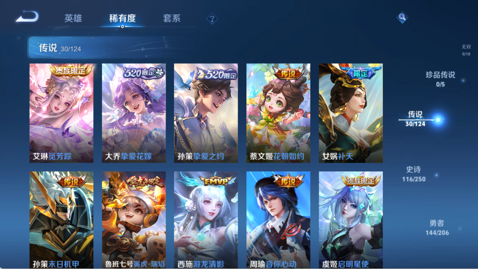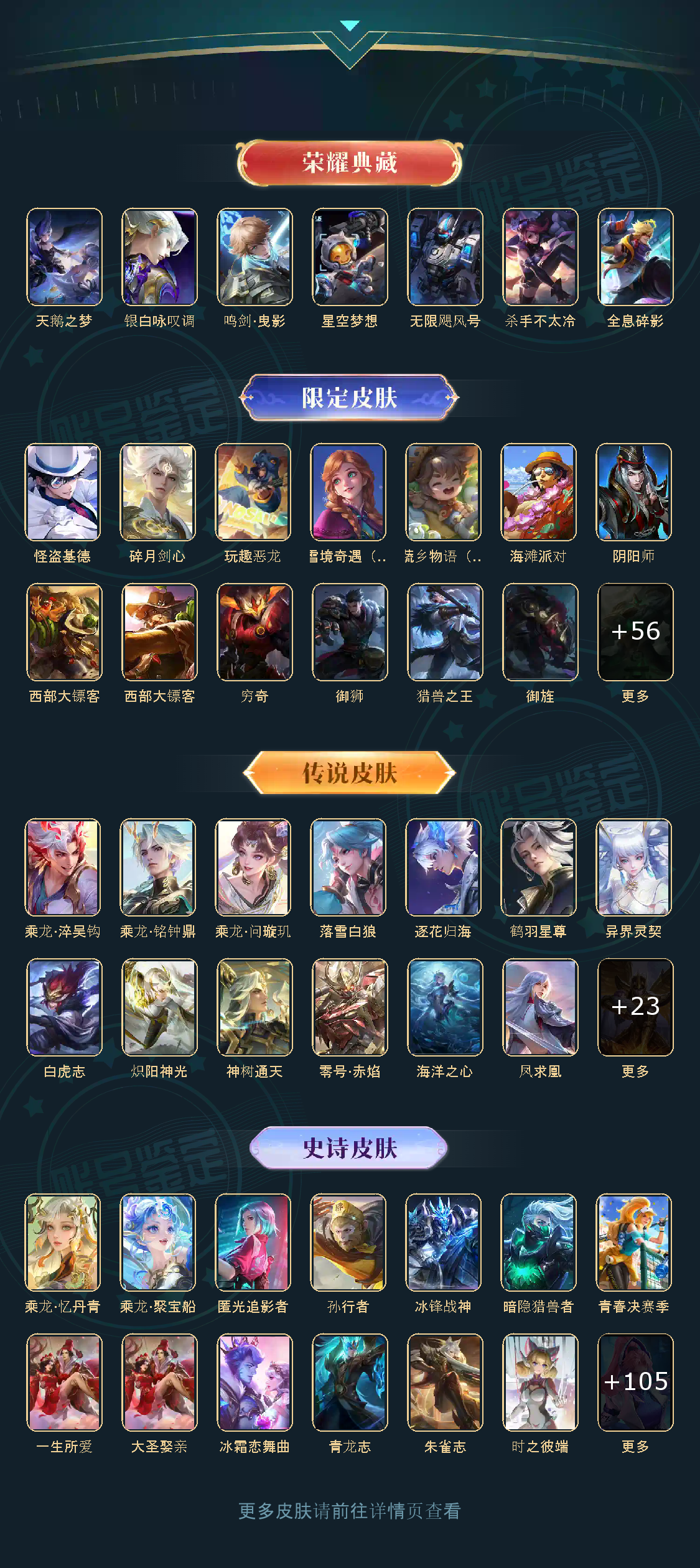 贵族等级V10,英雄数量125,典藏皮肤数7,皮肤数量395,