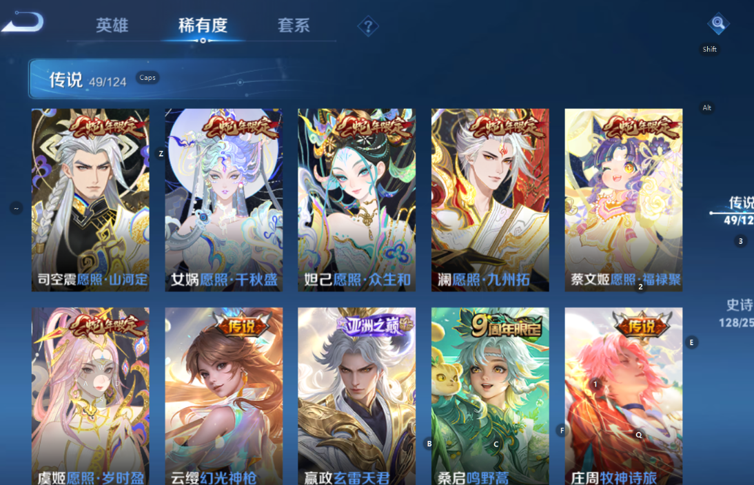 贵族等级V10,英雄数量124,典藏皮肤数4,皮肤数量405,天鹅之梦/星域神启
