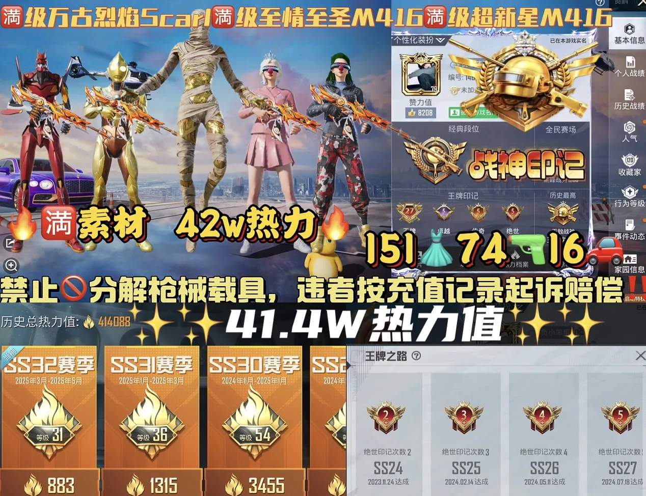 哪吒全套已补极品素材号,毁车罚款10000元毁枪罚款3000元人民币!租客须知◆ 本账号已在公安局备案,请勿对账号做出非法操作 如:开挂,坐挂车,使用第三方工具等,请您和谐游戏,如有损害财务的情形必追究到底如账号触发账号系统,会为您补上时间,到时不会下线,直到下一位租客租赁账号为止 请尽量不要以**进行维权 恶意维权,恶意维权者进行拉黑处理,永不放出 如果您喜欢本账号,可以点个收藏