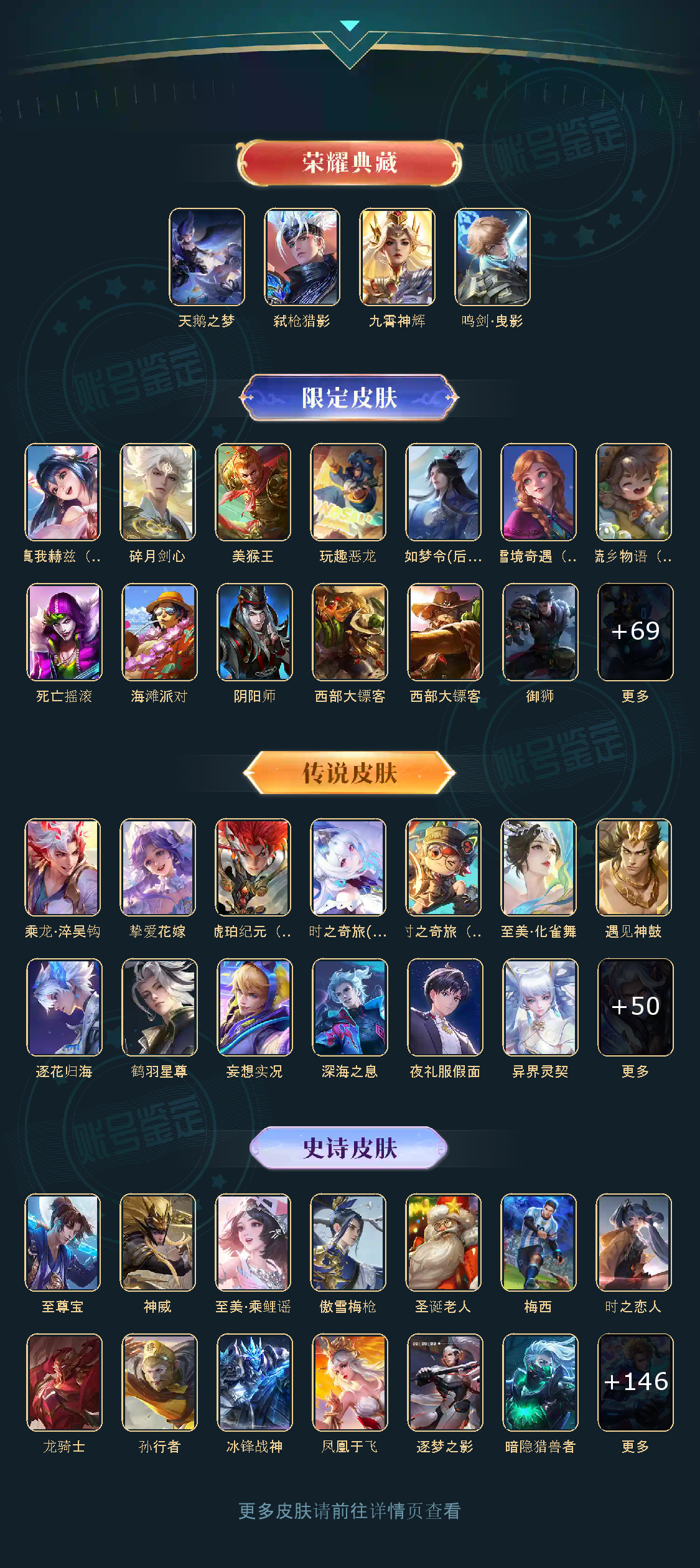贵族等级V10,英雄数量123,典藏皮肤数4,皮肤数量500,天鹅之梦/鸣剑·曳影