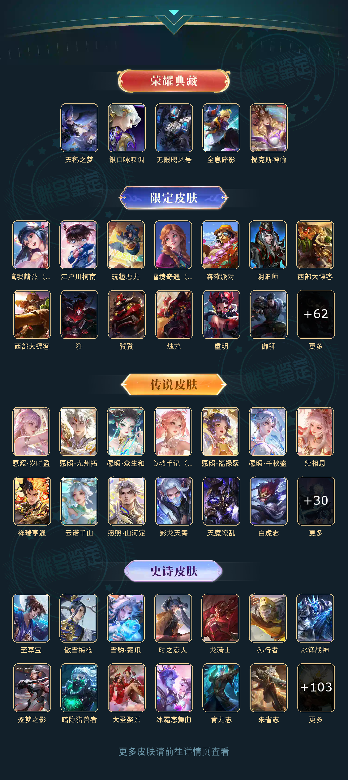 贵族等级V10,英雄数量125,典藏皮肤数5,皮肤数量411,冰锋战神街头霸王天鹅之梦天魔缭乱至尊宝凤求凰逐梦之影无限飓风号全息碎影大圣娶亲冰霜恋舞曲青龙志白虎志朱雀志久胜战神飞衡梁祝倪克斯神谕白鹤梁神女武圣孙行者傲雪梅枪时雨天司