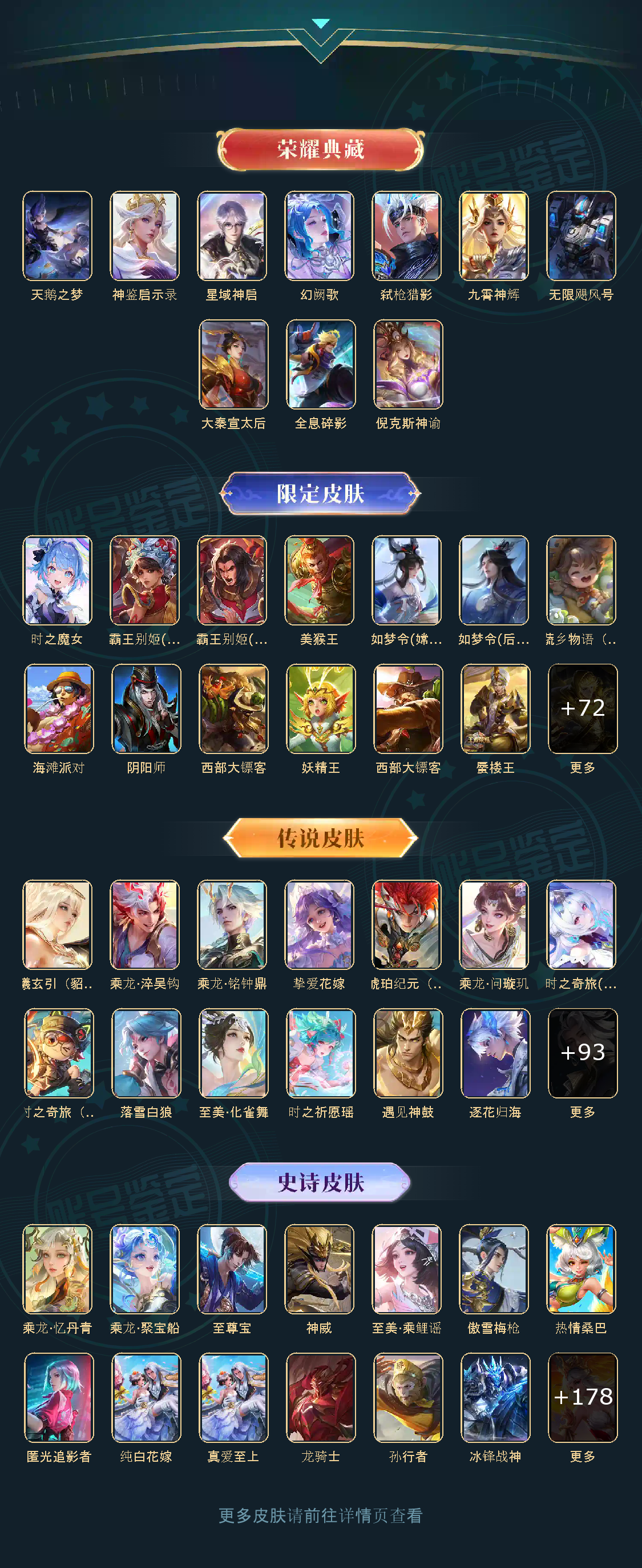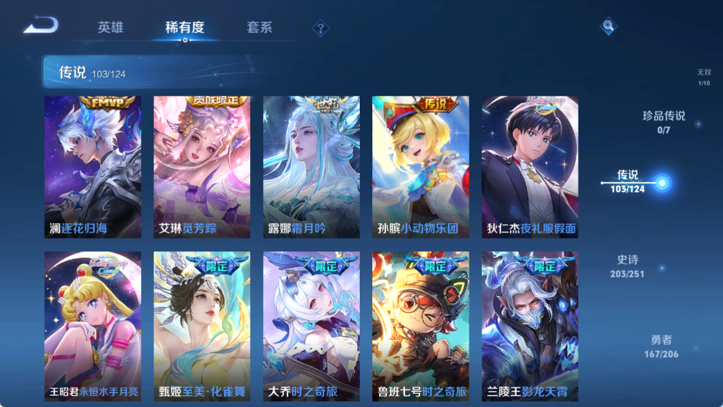 贵族等级V10,英雄数量124,典藏皮肤数10,皮肤数量564,天鹅之梦/大秦宣太后/无限飓风号/全息碎影/倪克斯神谕/星域神启