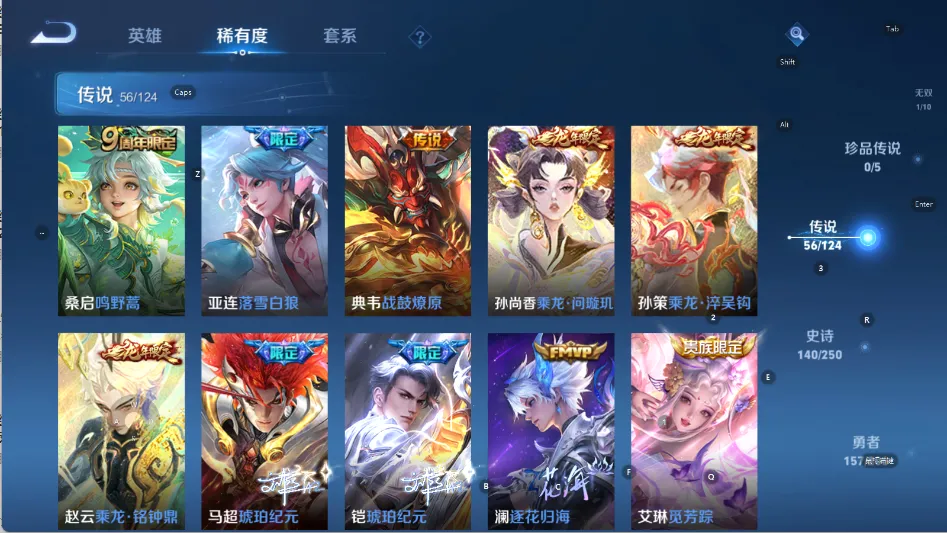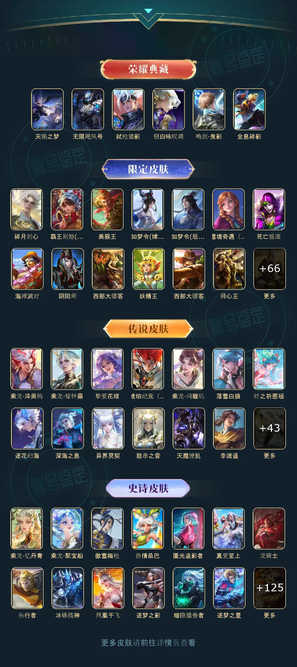 贵族等级V10,英雄数量125,典藏皮肤数6,皮肤数量443,天鹅之梦/无限飓风号/全息碎影/鸣剑·曳影
