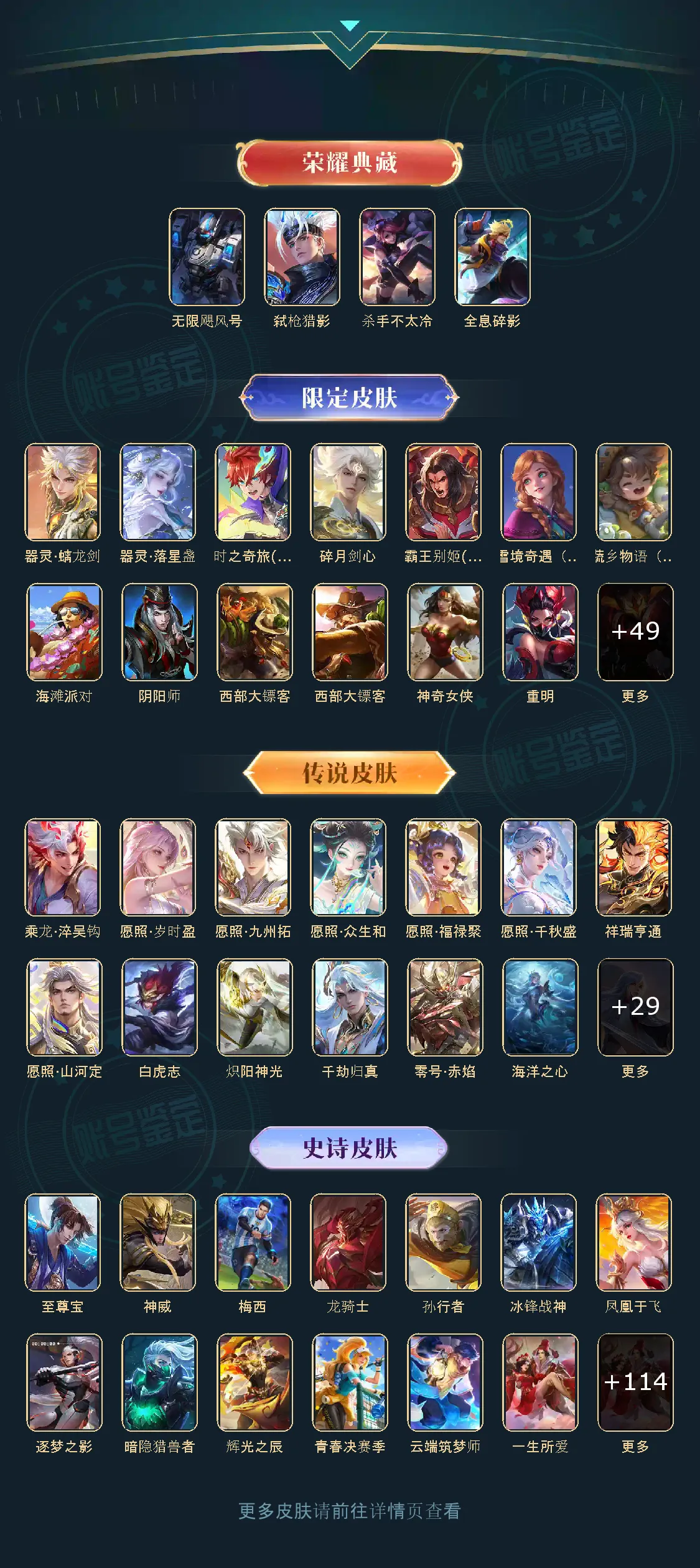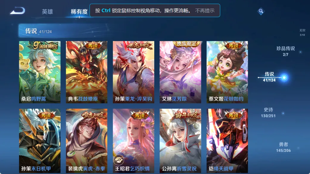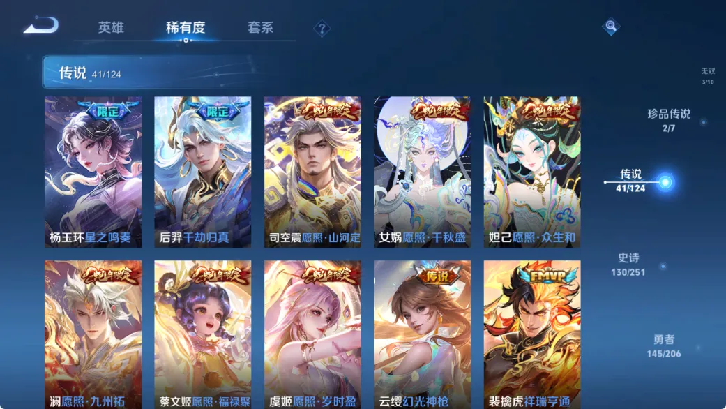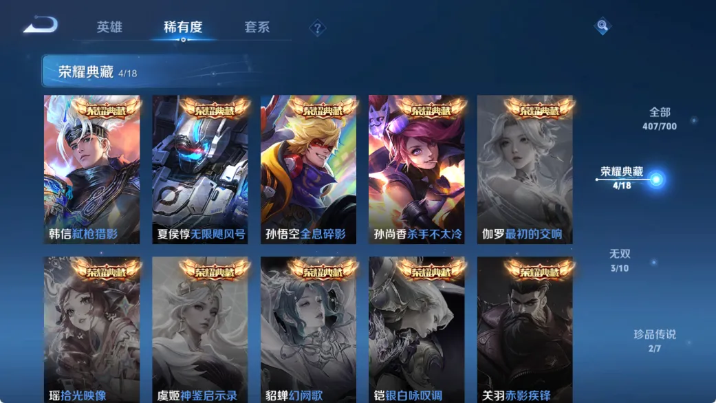 贵族等级V10,英雄数量124,典藏皮肤数4,皮肤数量407,