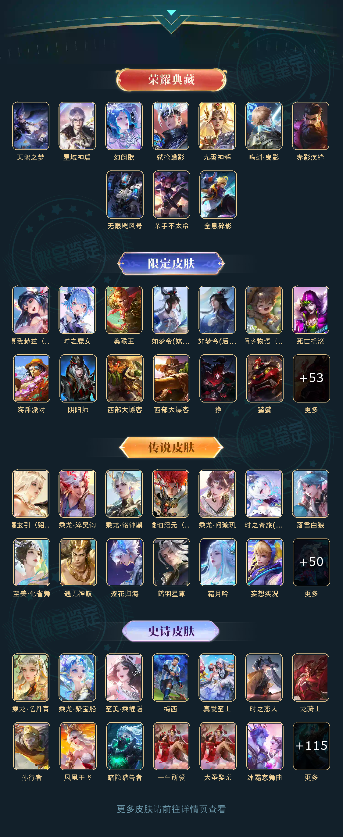 贵族等级V10,英雄数量124,典藏皮肤数10,皮肤数量417,天鹅之梦/杀手不太冷/无限飓风号/全息碎影/鸣剑·曳影/星域神启