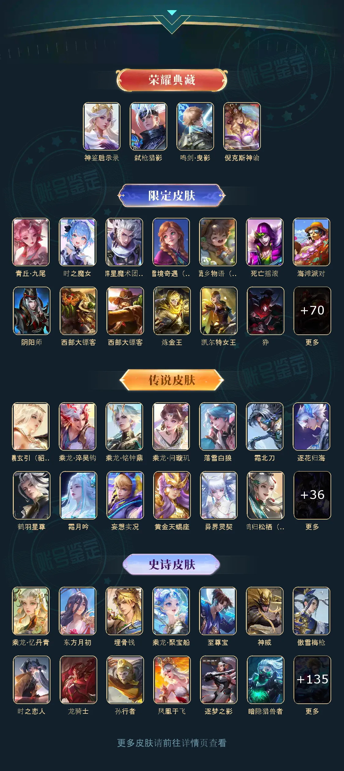 鸣剑·曳影,神鉴启示录,弑枪猎影,群星魔术团(韩信),青丘·九尾,时之魔女,天魔缭乱,白虎志,零号·赤焰,炽阳神光,乘龙·问璇玑,乘龙·淬吴钩,乘龙·铭钟鼎,乘龙·聚宝船,乘龙·忆丹青,至尊宝,神威,冥王哈迪斯,落雪白狼,霜北刀,逐花归海,鹤羽星尊,曦玄引(貂蝉),霜月吟,东方月初,妄想实况,埋骨钱,黄金天蝎座,异界灵契,神树通天,鹤归松栖(云缨),傲雪梅枪