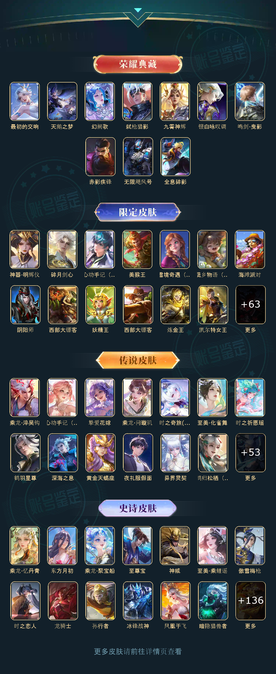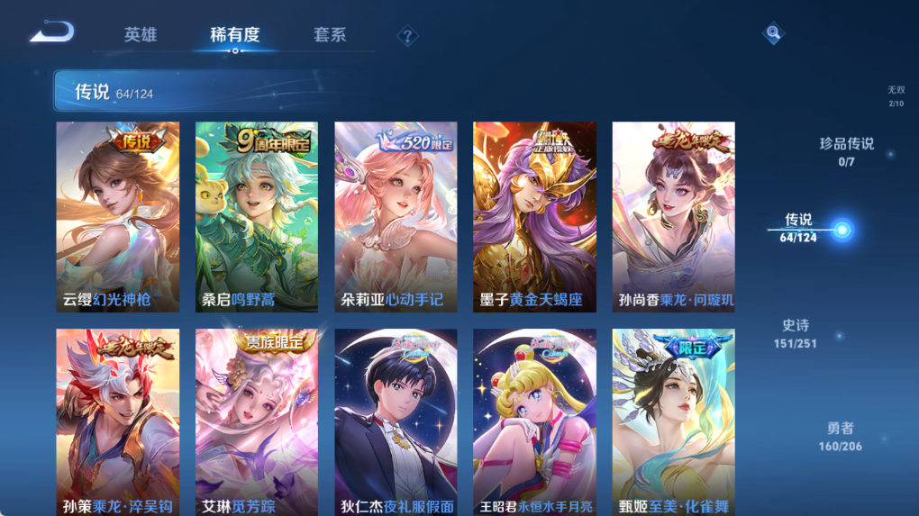 贵族等级V10,英雄数量125,典藏皮肤数9,皮肤数量467,