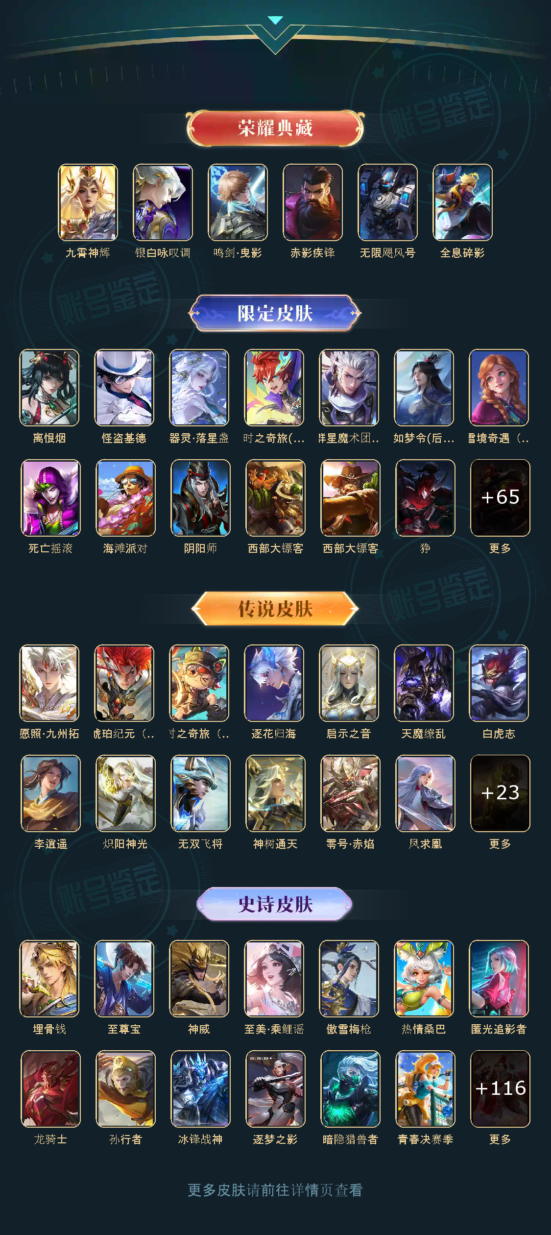 无限飓风号,鸣剑·曳影,赤影疾锋,九霄神辉,银白咏叹调,群星魔术团(韩信),离恨烟,天魔缭乱,白虎志,李逍遥,零号·赤焰,怪盗基德,炽阳神光,热情桑巴,至尊宝,神威,愿照·九州拓,匿光追影者,时之奇旅(鲁班七号),无双飞将,逐花归海,器灵·落星盏,琥珀纪元(马超),至美·乘鲤谣,时之奇旅(孙策),埋骨钱,启示之音,神树通天,傲雪梅枪