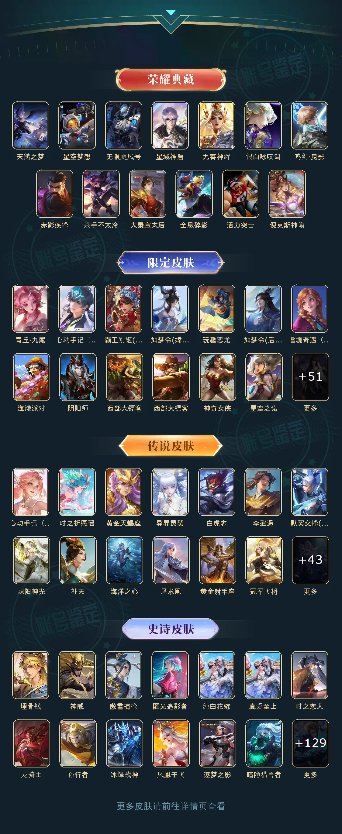 贵族等级V10,英雄数量124,典藏皮肤数13,皮肤数量435,星空梦想/无限飓风号/全息碎影/活力突击/倪克斯神谕/鸣剑·曳影/星域神启