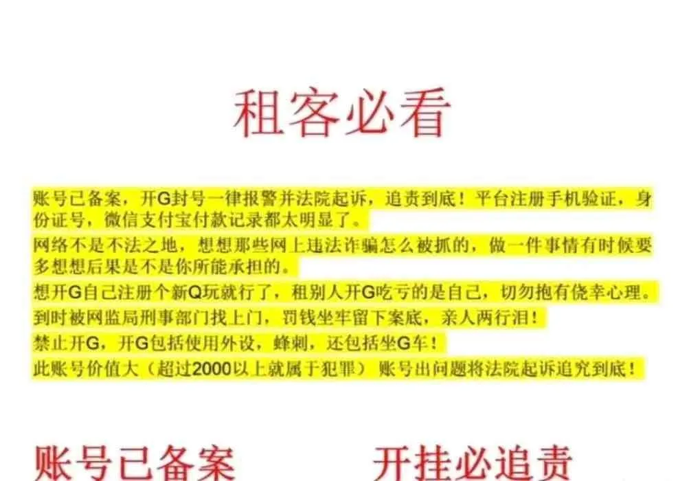 因人斂识别频繁,现包天出租、封号必究!!✅禁止使用第三方软件,如发现游戏被封等问题,足以构成犯罪并追究其法律责任!平台方会配合警方协助调查像平台索要下单ip、充值记录、手机号找到本人起诉到法院追回账号损失,根据《刑法》第二百七十五条恶意毁坏财产物罪:故意毁坏公私财物,数额较大或有其他严重情节,处罚三年以下有期徒刑,拘留或者罚金