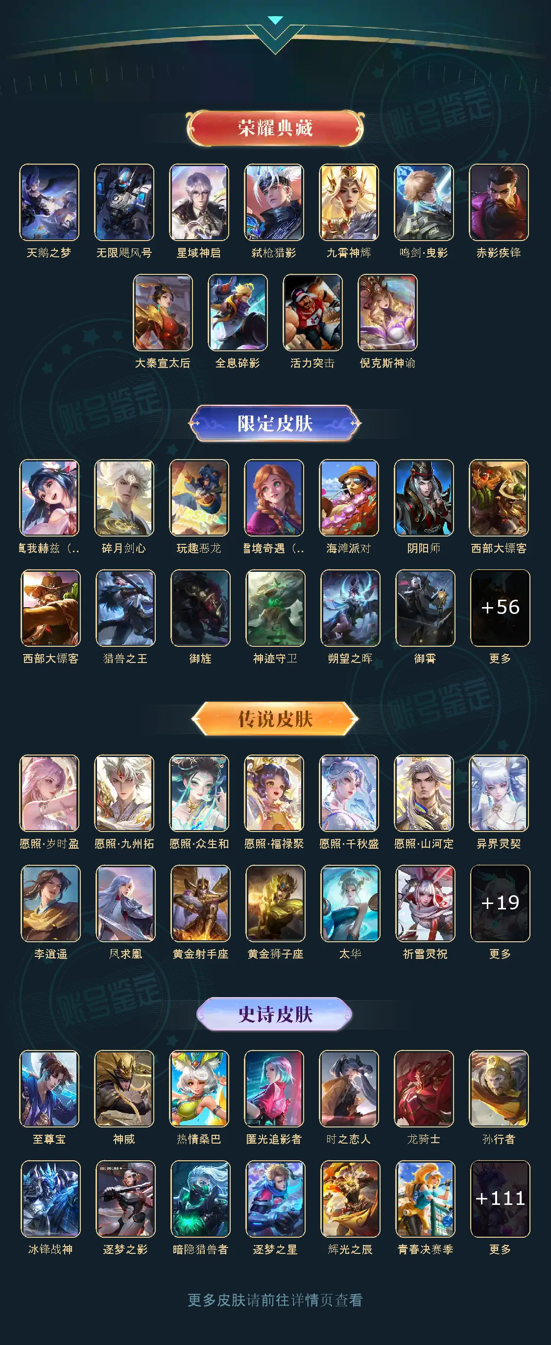 贵族等级V10,英雄数量124,典藏皮肤数10,皮肤数量392,