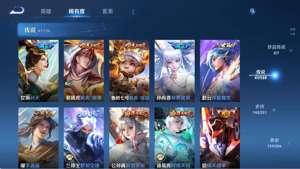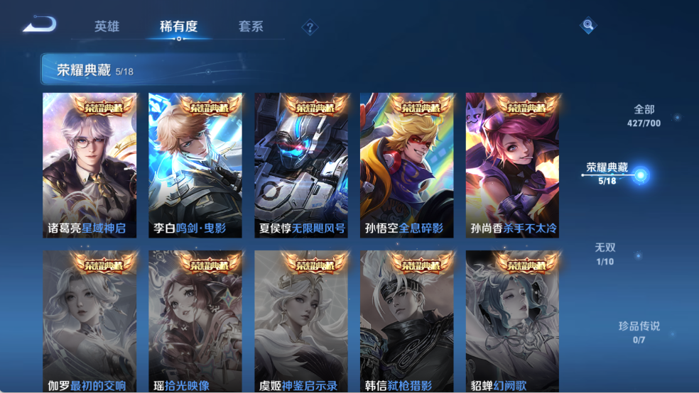 贵族等级V10,英雄数量124,典藏皮肤数5,皮肤数量427,
