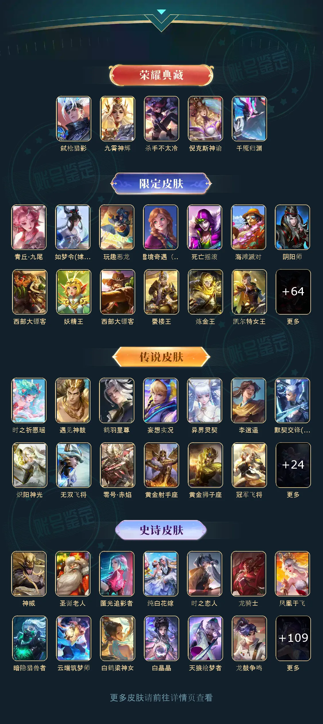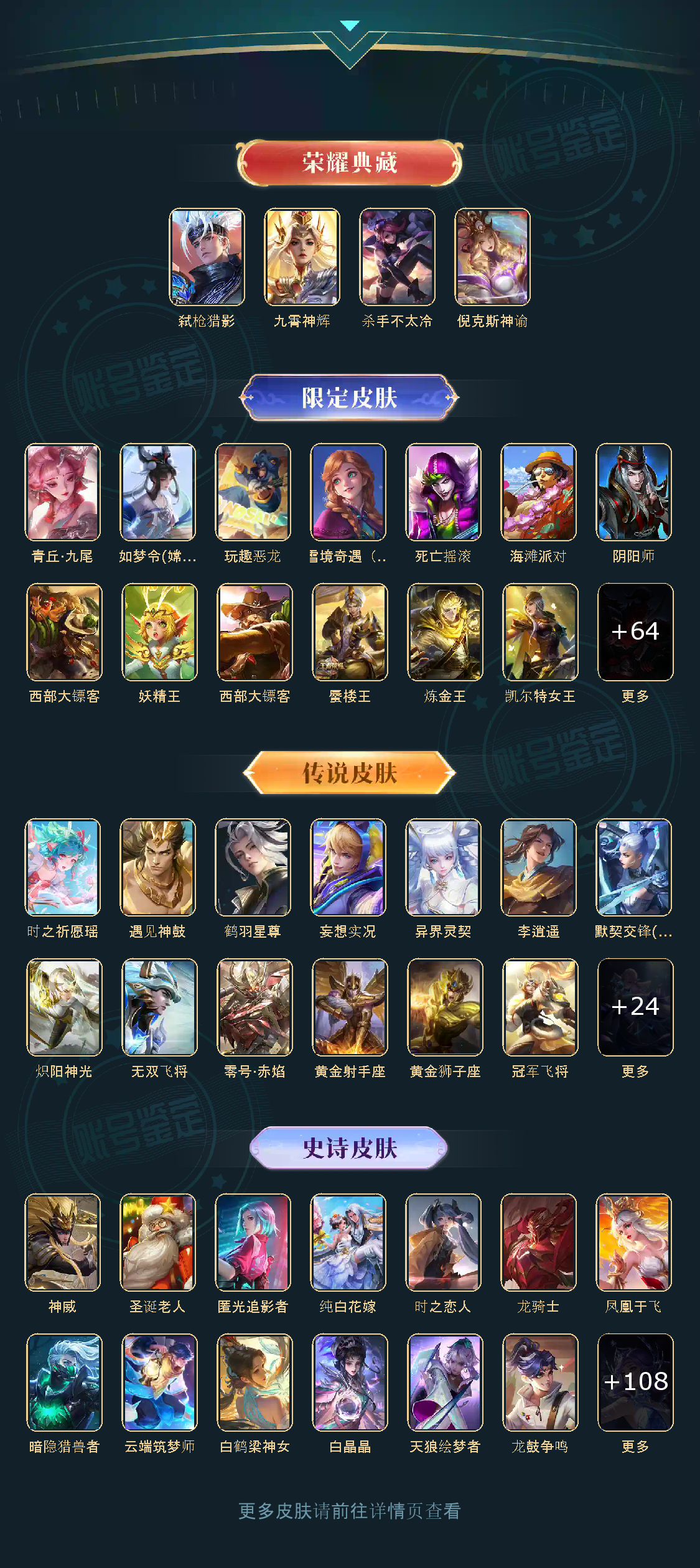 弑枪猎影,九霄神辉,青丘·九尾,李逍遥,默契交锋(花木兰),零号·赤焰,炽阳神光,圣诞老人,神威,纯白花嫁,匿光追影者,无双飞将,时之祈愿瑶,遇见神鼓,鹤羽星尊,妄想实况,异界灵契