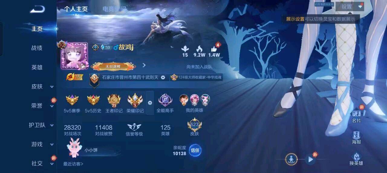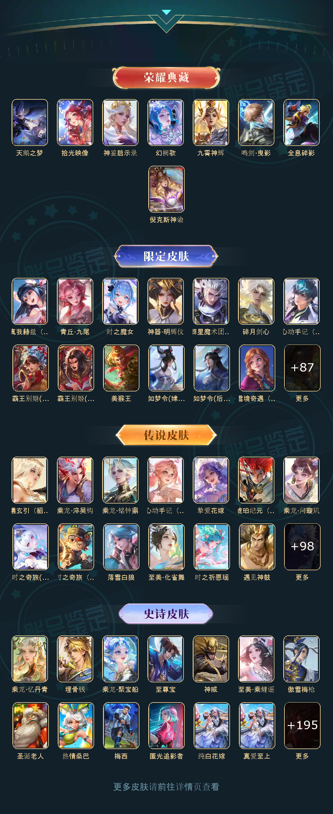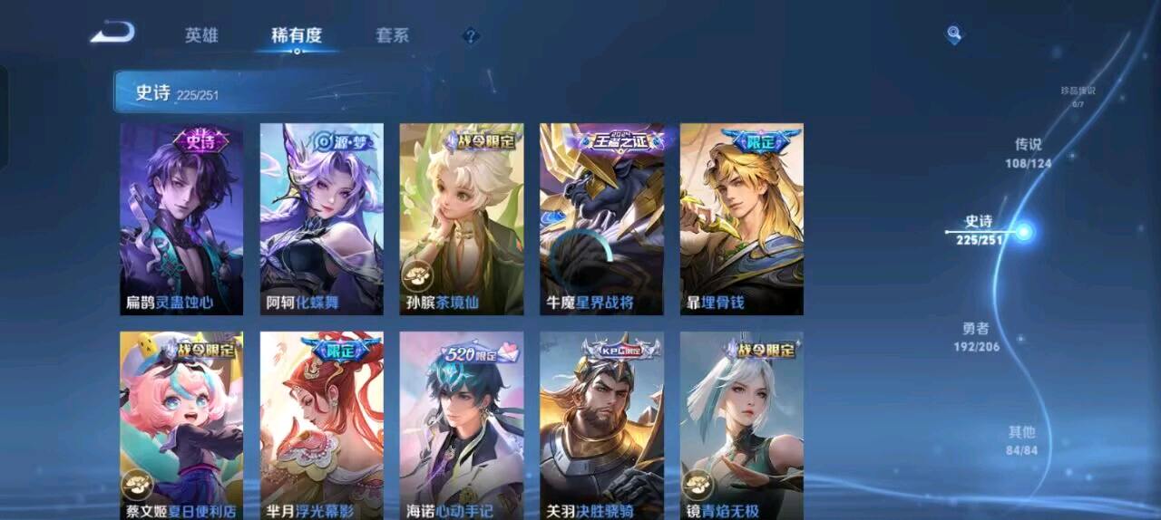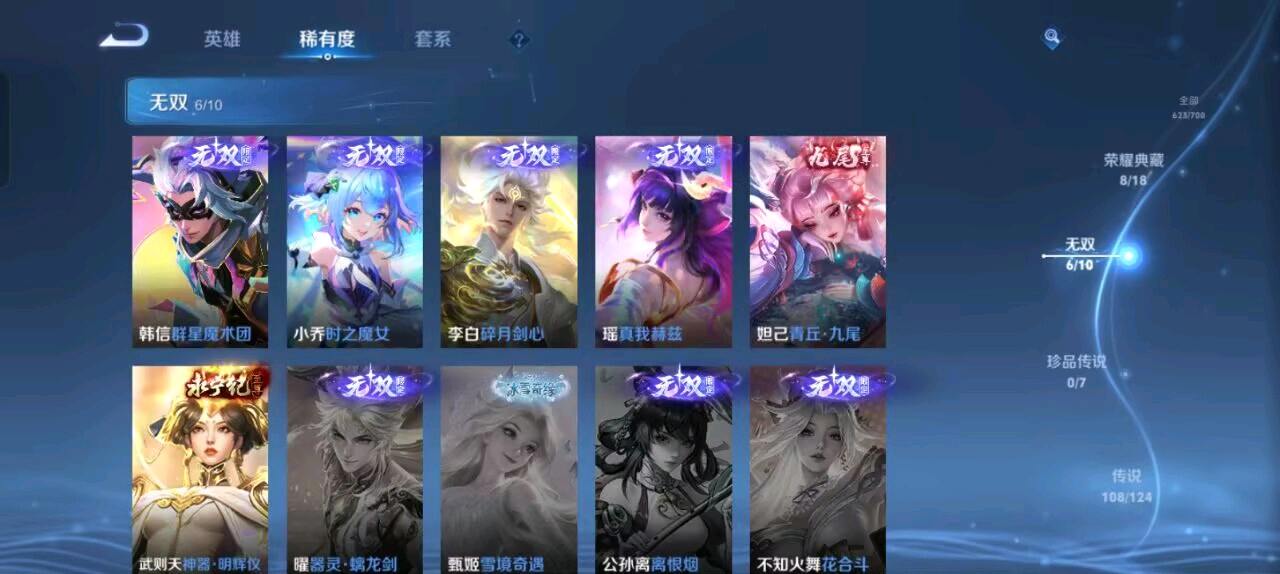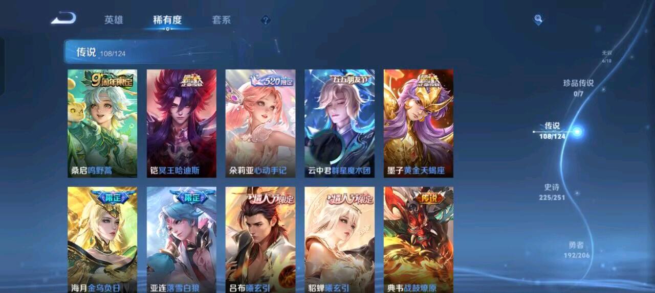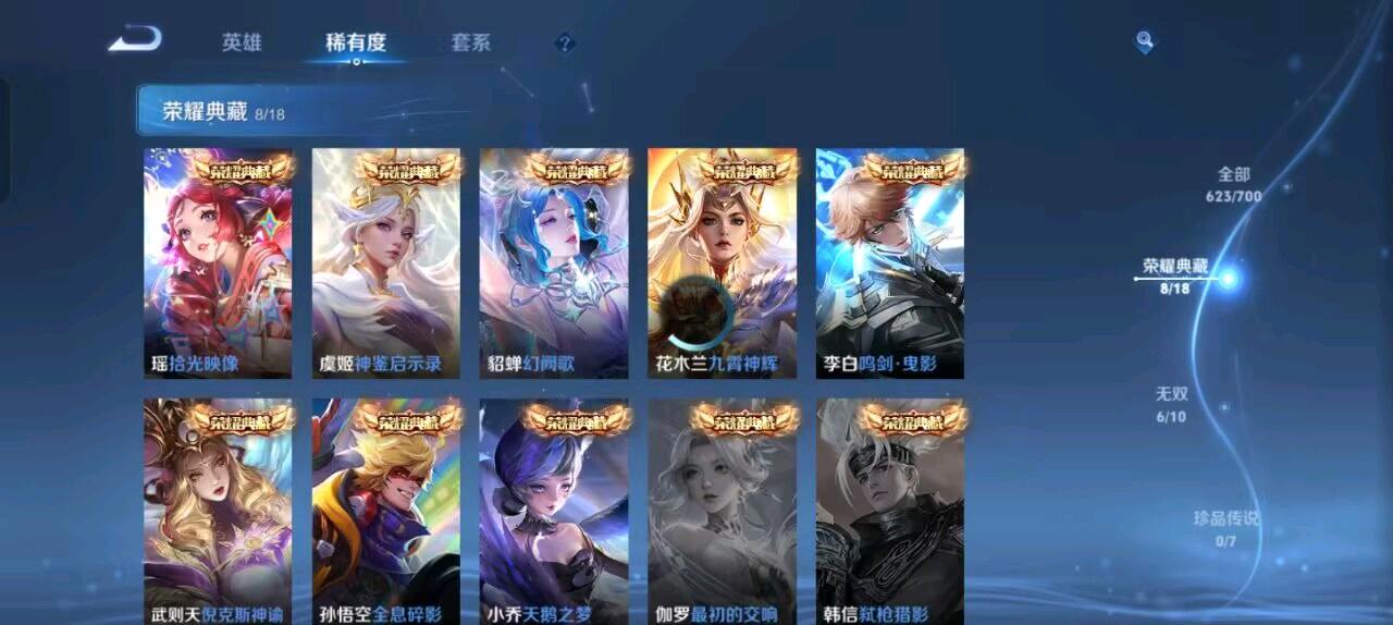 贵族等级V10,英雄数量125,典藏皮肤数8,皮肤数量623,纯白花嫁/天魔缭乱/至尊宝/真爱至上/圣诞老人/热情桑巴/梅西/青龙志/白虎志/朱雀志/久胜战神/飞衡/匿光追影者/鸣剑·曳影/星域神启/李逍遥/武圣/玉兔公主/补天/异界灵契/神威/启示之音/傲雪梅枪/时雨天司