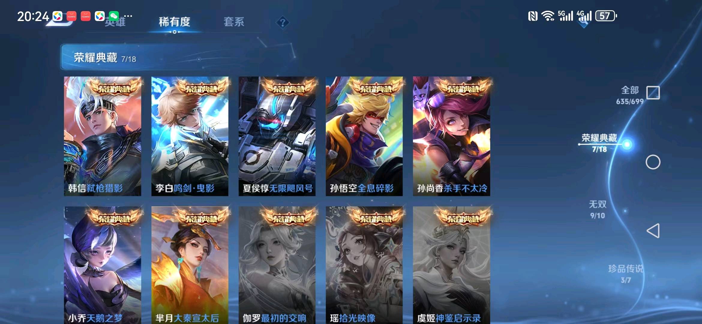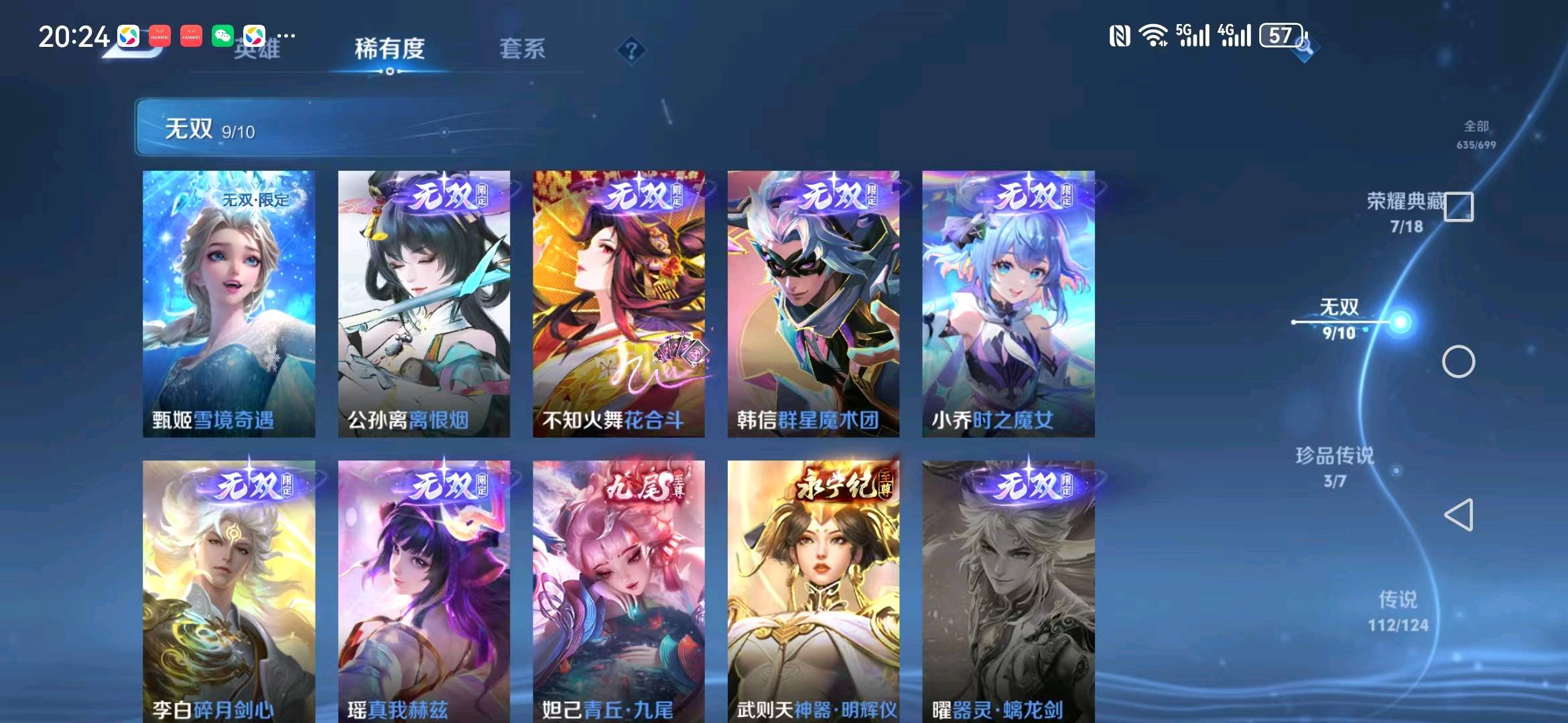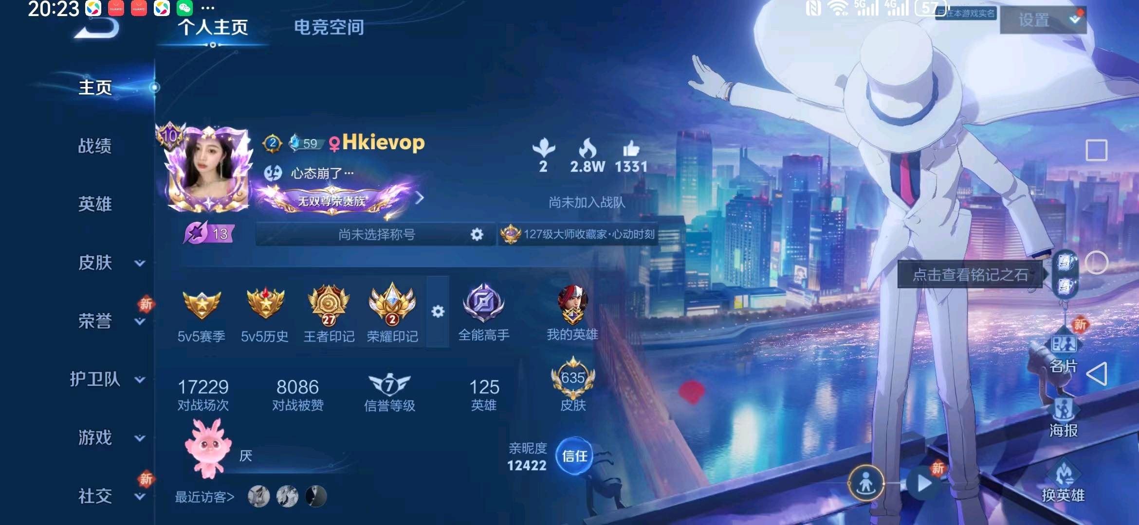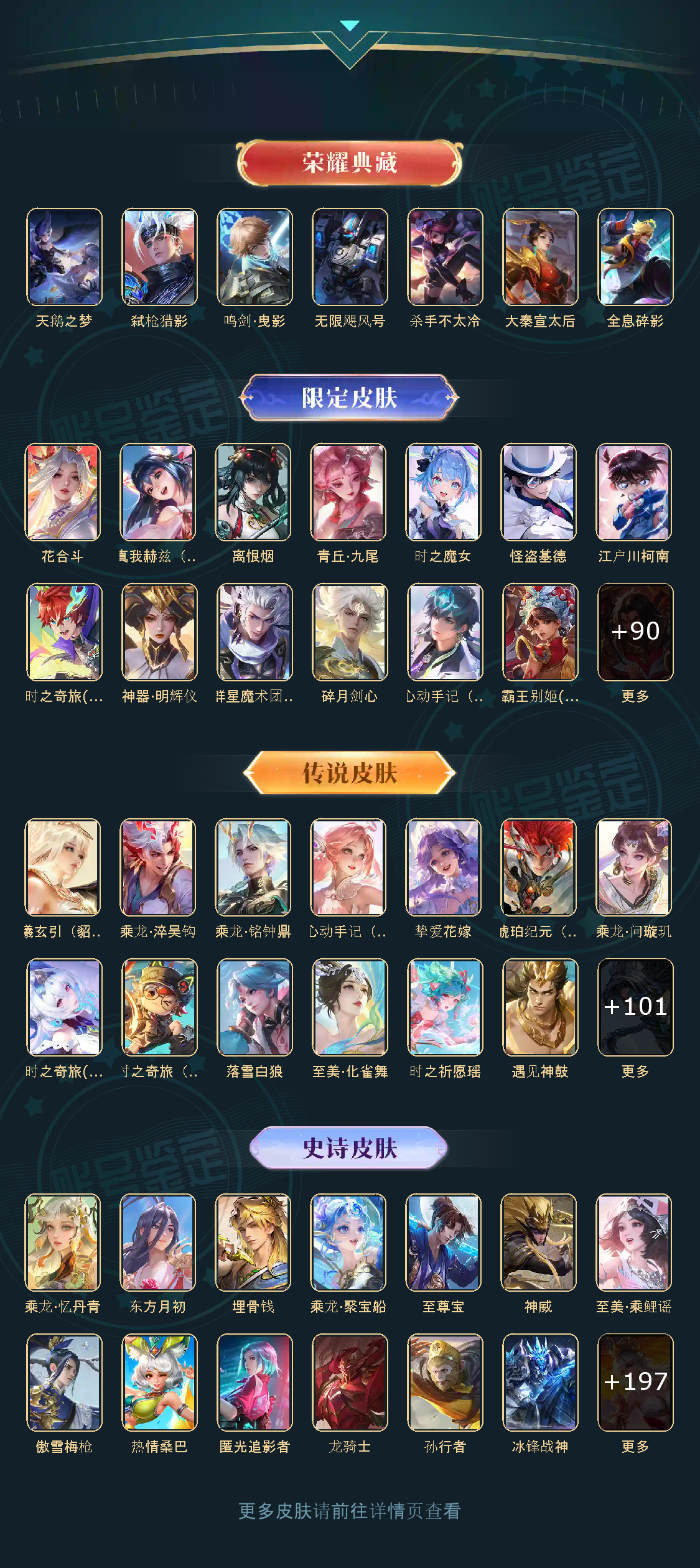 贵族等级V10无双贵族,英雄数量125,典藏皮肤数7,皮肤数量635,纯白花嫁/天魔缭乱/至尊宝/真爱至上/圣诞老人/热情桑巴/梅西/青龙志/白虎志/朱雀志/久胜战神/飞衡/匿光追影者/鸣剑·曳影/星域神启/李逍遥/武圣/玉兔公主/补天/异界灵契/神威/启示之音/傲雪梅枪/时雨天司