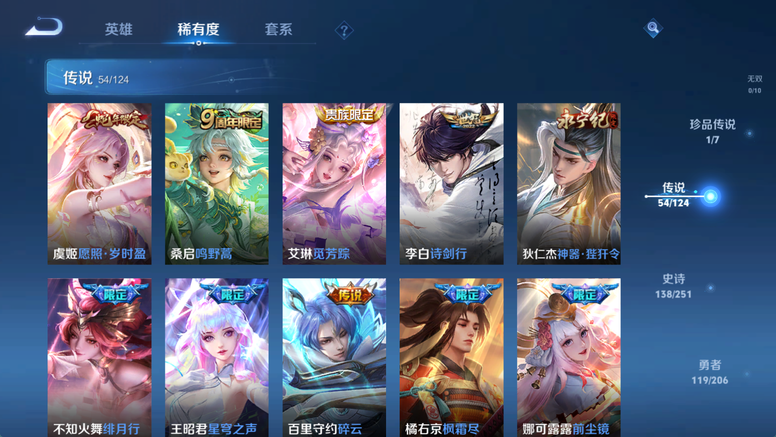 贵族等级V10,英雄数量125,典藏皮肤数10,皮肤数量402,天鹅之梦/杀手不太冷/星空梦想/无限飓风号/全息碎影/活力突击/倪克斯神谕/鸣剑·曳影/星域神启