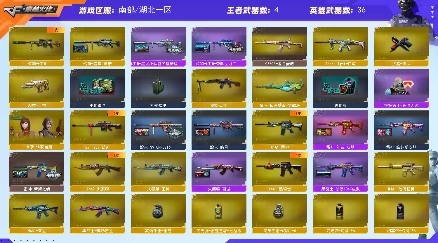 幻神+曹操+荣耀世冠白鲨+星火小队 】【星神炽天使】【scar白虎】【qbz金色蔷薇】【火麒麟】【雷神+荣耀之魄】【黑骑士】【毁灭+sv16冠军】 【武器:青龙 盘龙 炼狱 】 【手呛:修罗 天神】 【4刀具:屠龙*2 幻灵之峰 龙啸烈火龙威 】 【6雷套:幻灵雷*6】 【小人呛:白虎迷你小艾 雷神小红 星神炽天使】 【四防角色:王者零华冠丽服 超能女侍觉 职业经理