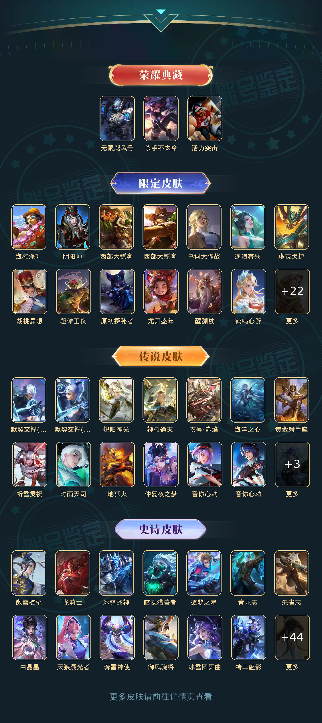 贵族等级V7,英雄数量125,典藏皮肤数2,皮肤数量170,冰锋战神/街头霸王/杀手不太冷/无限飓风号/青龙志/朱雀志/梁祝/奔雷神使/傲雪梅枪/时雨天司
