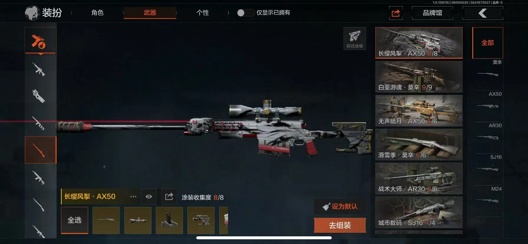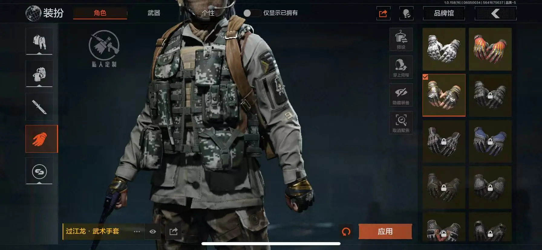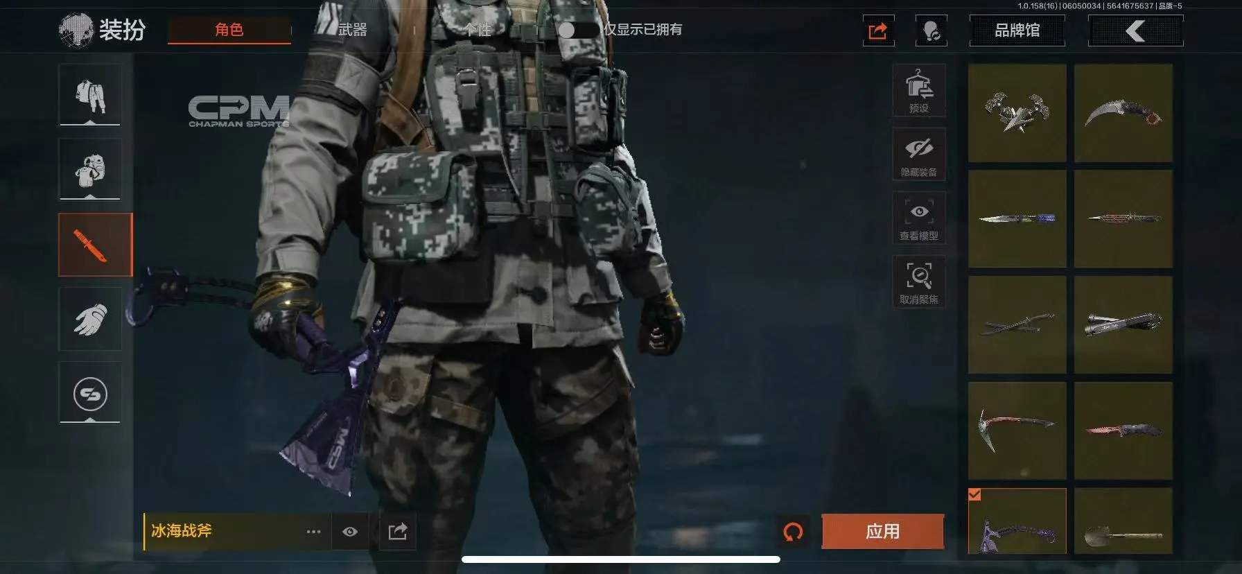 近战武器:寒牙手刺,下弦月,涂鸦利刃,胜利军刀,明刀绣春,龙魂双节棍,冬日冰镐,瑞兔折刀,冰海战斧,工兵铲,;手套:玉鸾挂枝手套,禁忌力量手套,过江龙武术手套