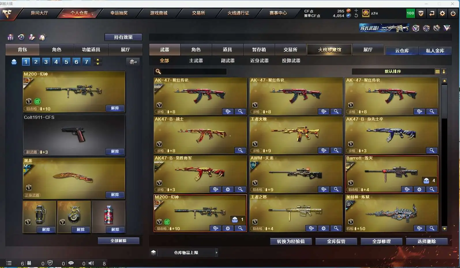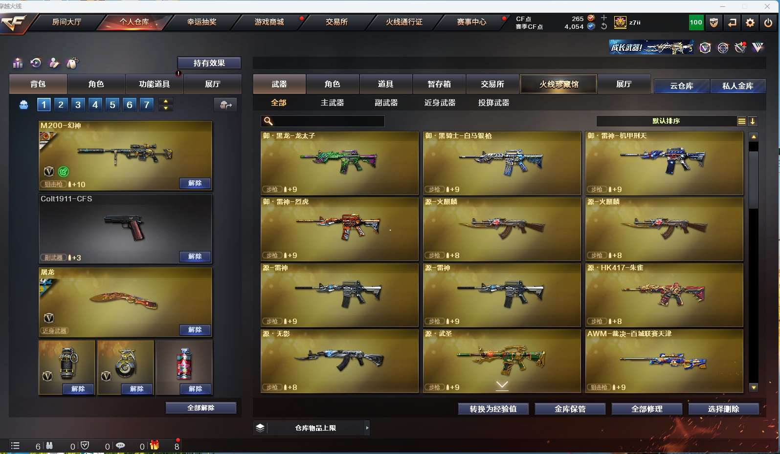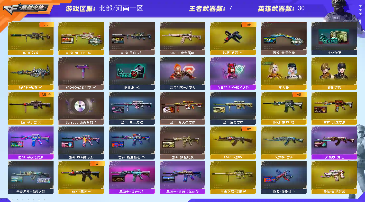 【m200幻神+周瑜+ag24冠军】【qbz金色蔷薇】【hk417朱雀】【火麒麟+横秒之巅】【雷神】【黑骑士】【毁灭+卡】 【武器:王者之怒 王者之心 王者火魄 天龙 炼狱*2】 【4手呛:修罗*3 天神】 【6刀具:屠龙*2 龙啸*2 斩神刀雷暴 龙啸烈火龙威】 【雷套:雷暴雷】 【音效卡:毁灭音效卡 】 【四防角色:王者春】