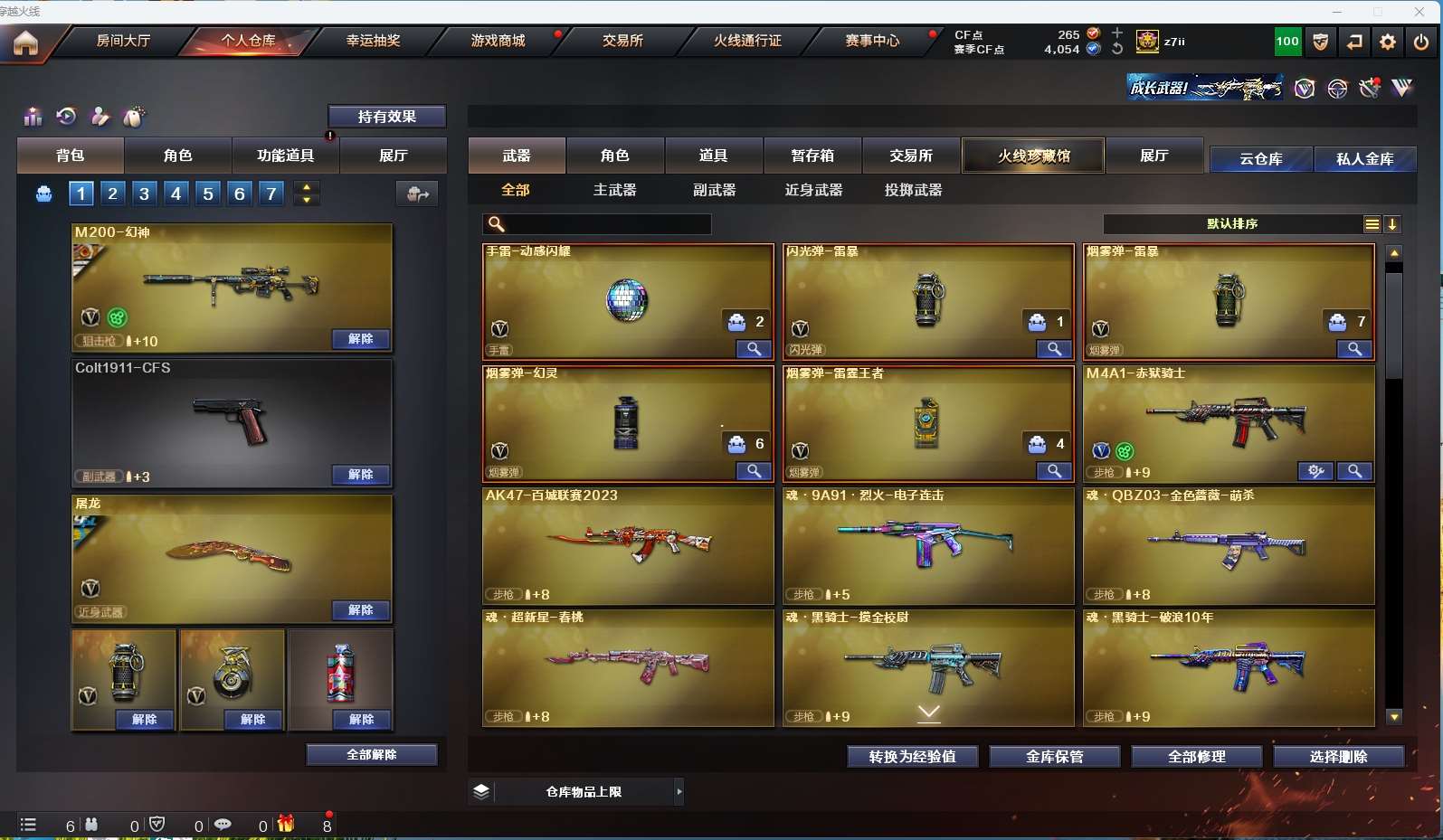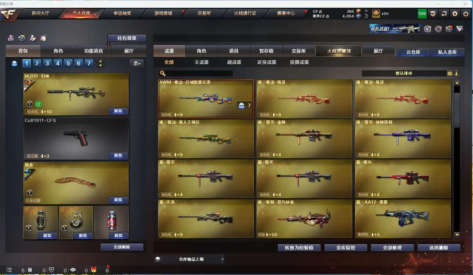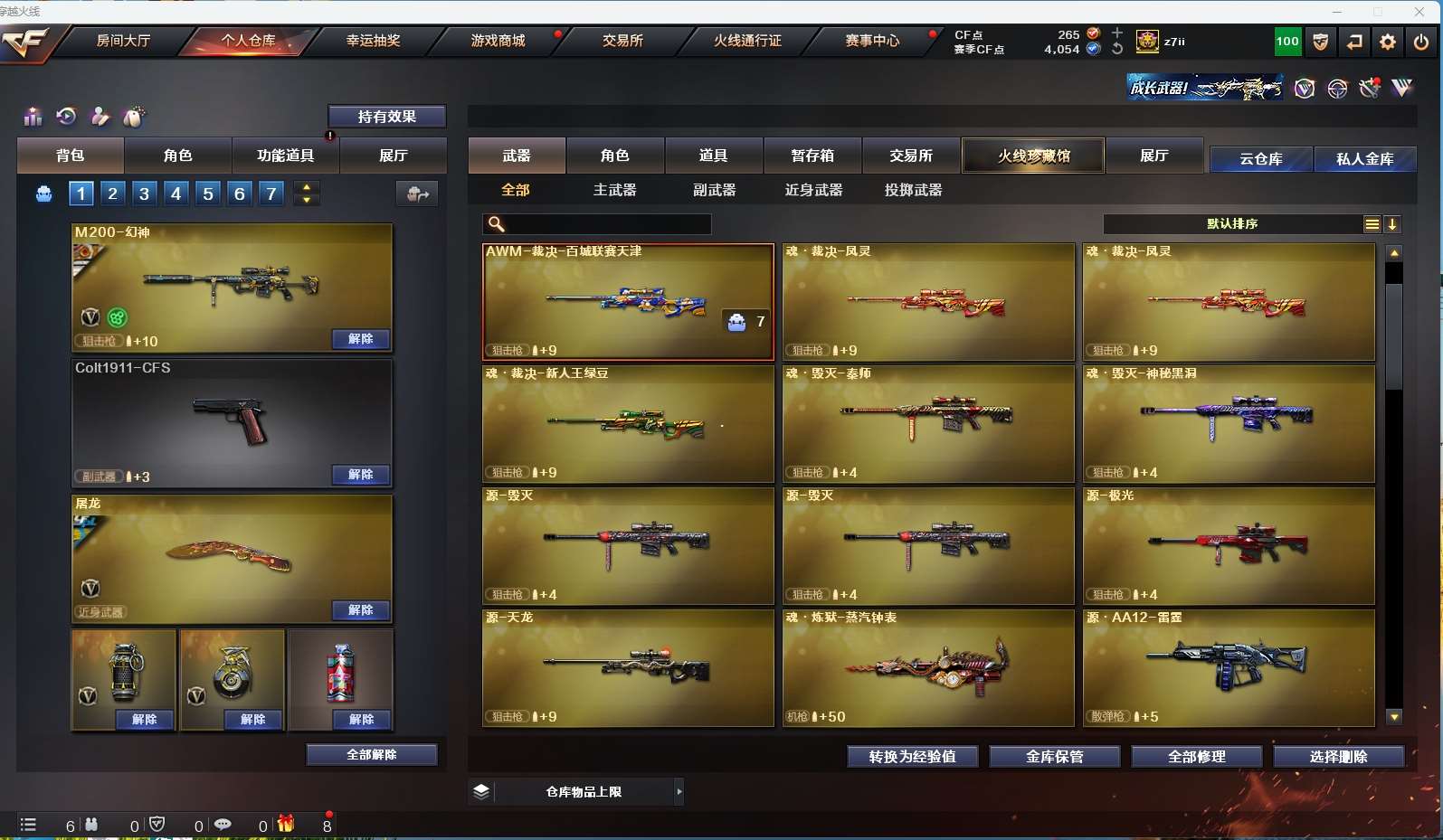 【m200幻神+周瑜+ag24冠军】【qbz金色蔷薇】【hk417朱雀】【火麒麟+横秒之巅】【雷神】【黑骑士】【毁灭+卡】 【武器:王者之怒 王者之心 王者火魄 天龙 炼狱*2】 【4手呛:修罗*3 天神】 【6刀具:屠龙*2 龙啸*2 斩神刀雷暴 龙啸烈火龙威】 【雷套:雷暴雷】 【音效卡:毁灭音效卡 】 【四防角色:王者春】